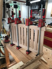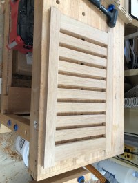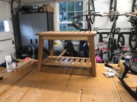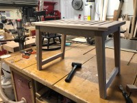 The project is in the home stretch now. This week I was able to finish up the seat and shelf assemblies and apply the first coat of oil. The seat and shelf are made basically the same way; the frame is joined with bridle joints and the slats are mortise and tenons. The lower shelf slats are thinner than the seat slats so those slats get a roundover on both sides so they fit into the rounded mortises without a shoulder.