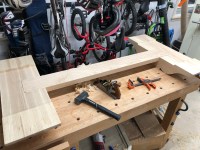 I finished up the week by drilling and installing the threaded inserts which will be used to attached the stretchers to the pedestals. This will allow the piece to come apart for transporting it. I would estimate the base alone to weigh around 200 lbs so there would no way of building this as one solid piece.