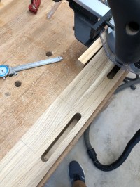 The top is constructed with a functional breadboard on each end. This is the board running perpendicular to the field of the table . The purpose of this board is to help keep the top flat over time, specifically from cupping. Because wood expands and contracts, you cant just glue it in place like the rest of the table. It has to allow the field of the table to move, up to 1/4″ each season, or the table will crack. A series of deep mortises in the breadboards receive the tenons cut on the table top. Only the center mortise gets glue in place, and the rest of the joints are held together with drawbored pegs. The table can expand inside the joint keeping the center glued in place.
