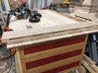 The client wanted the overall feel of the table to be farmhouse, so I routed a v-groove along each joint in the field of the table and a 1/16 roundover on the breadboard joints to accentuate the individual boards of the table.