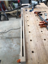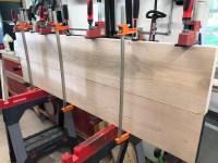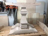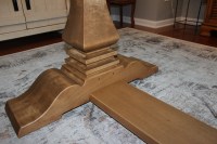 To start I focused on the pedestal base. The first one had an 8″ square column with 10″ wide foot. These dimensions were fairly arbitrary at the time, but on this go around I wanted to use four 8/4 (2″) boards to make the column, instead of five, and leave the foot only slightly wider rather than having it a full 2in wider. I was able to mill the 8/4 stock down to about 1 3/4″ and ended up with a 7″ column. I used the same thickness to laminate the foot and added a 1″ thick board in the middle to make the foot 1″ wider. This gave me a consistent 1/2″ reveal around the mortise of the foot which made for a nicer transition from the foot into the column. I was also able to save about 10 bd ft of lumber for each pedestal which reduced the materials needed and saved a little weight as well. The narrower foot also provides more room for chairs to slide under.