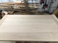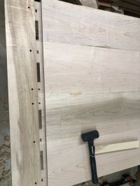 The top is a traditional breadboard top. I chose the widest boards I could find when buying the lumber and I ended up with a 42″ wide top with only four boards! One board was 13.5″ wide which I had to cut down a bit to fit my 12″ jointer and to make the boards a bit more uniform in width. The field of the table is made of simple edge glued boards. Each end received a functional breadboard which will help keep the table flat overtime and allow the field to expand and contract with the seasons. I cut 2.5″ long tenons on the end of the table and corresponding mortises in the breadboard. The center tenon is glued and pinned with drawbored pegs. The other four tenons are left dry and only pinned with the drawbore pegs, but this time, the peg holes are elongated. This allows the table to expand/contract without splitting apart.