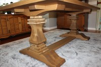 The two pedestals are joined together with 3 stretchers: 2 half lap the arms of the pedestals and one half laps through center of the feet. These joints are secured with knockdown bolts and threaded inserts.