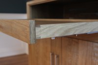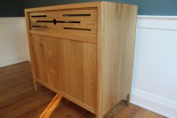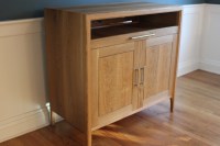 This week I completed this media console. It is made of solid White Oak, and is designed to house record player equipment on the pull out tray and for a TV to sit on top. I’m considering this a Danish Modern design as the overall design is minimalist with subtle details that reveal themselves when you are up close. Clean lines blended with large roundovers and small shadow lines give this modern design character and interest that can fit in any home.