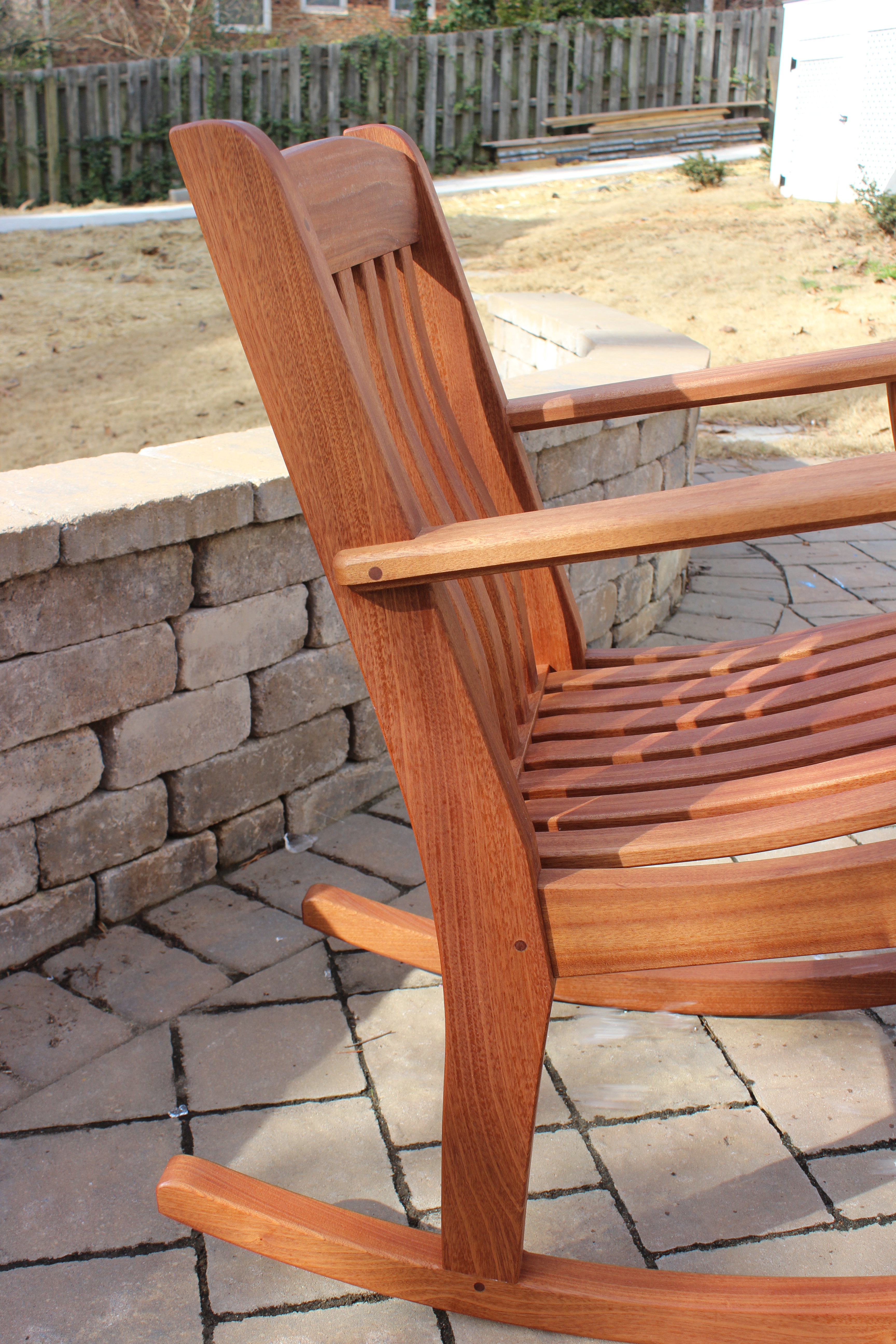 This rocking chair is the perfect place to relax and enjoy the outdoors. Featuring curved back and seat slats that follow the contour of your body, one could sit in these for hours by the fire, in their garden or on the porch. The arms feature a relief towards the back slats providing more room for you to sit while maintaining a larger front section for resting your hand or drink. Compared to store bought rockers, these are much more substantial with thick 1-3/4″ main frame and 3/4″ thick slats. The extra weight, and 44″ rocker radius create a smooth, effortless rock for you to enjoy. Constructed with extra large mortise and tenons, pinned for longevity, these rockers will outlast their owners. Made of Sapele, the chairs are rot resistant and only require minimal maintenance each year. A simple application of exterior oil will maintain the natural, deep red tones of the Sapele. Or, let them age without oil for a weathered, grey look.
