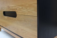 This kitchen island screams “cool.” Ebonized Red Oak and natural White Oak create the perfect contrast for a modern look. The sleek, minimalist design allows the subtle details and the grain take the show. Although it is designed to look like a piece of furniture, this case is 30″ deep allowing it to serve as a very functional kitchen island. The four drawer fronts share an integrated finger pull in a rounded rectangular shape blending form and function. Extra large 12″ deep drawers provide ample storage for all kinds of kitchenware. One bank of drawers is split into two providing efficient use of space for smaller items like utensils. Made of Poplar and dovetailed for strength, even the drawers are a show stopper with tones of pale whites, green, brown, black and even purple. The additional depth allows room for adjustable shelves on the back of the cabinet to store cookbooks and other kitchen items.