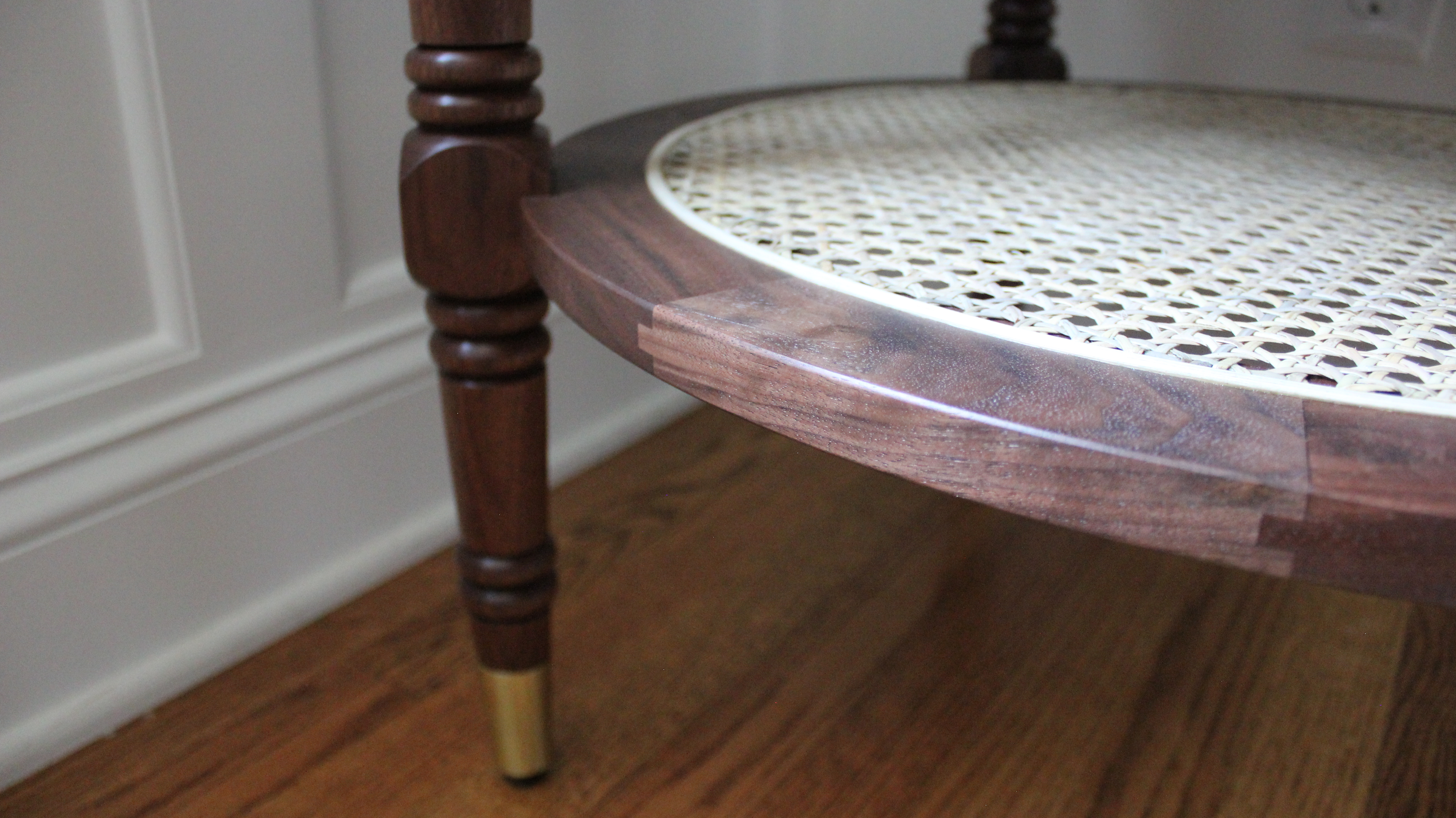 The Hubbard side table blends both formal and casual details for a classic British Colonial design. The round form works great in a corner of the room or in between two chairs. Turned legs with double beads taper to a brass foot for a light, formal aesthetic. The natural rattan webbing in the lower shelf creates a stunning contrast with the deep chocolate tones of the Walnut, and is a classic design element of Colonial furniture of the West Indies. The top features a contrasting inlay border creating visual continuity between the top and bottom.