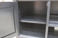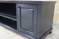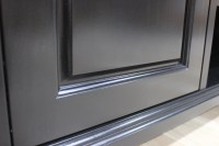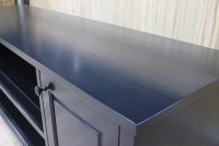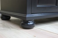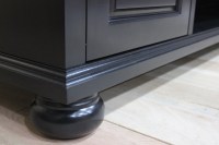 This entertainment console was designed to fit a high quality sound bar/center channel along with a TV and gaming systems to complete a home theater room. Designed in a transitional style, the piece features some traditional elements including raised panel doors, cove & bead edge profiles and turned bun style feet. Built in ventilation fans in the lower shelf keep equipment cool for hours of enjoyment. Invisible SOSS hinges keep the inside of the cabinets unobstructed and provide a clean look to the interior.