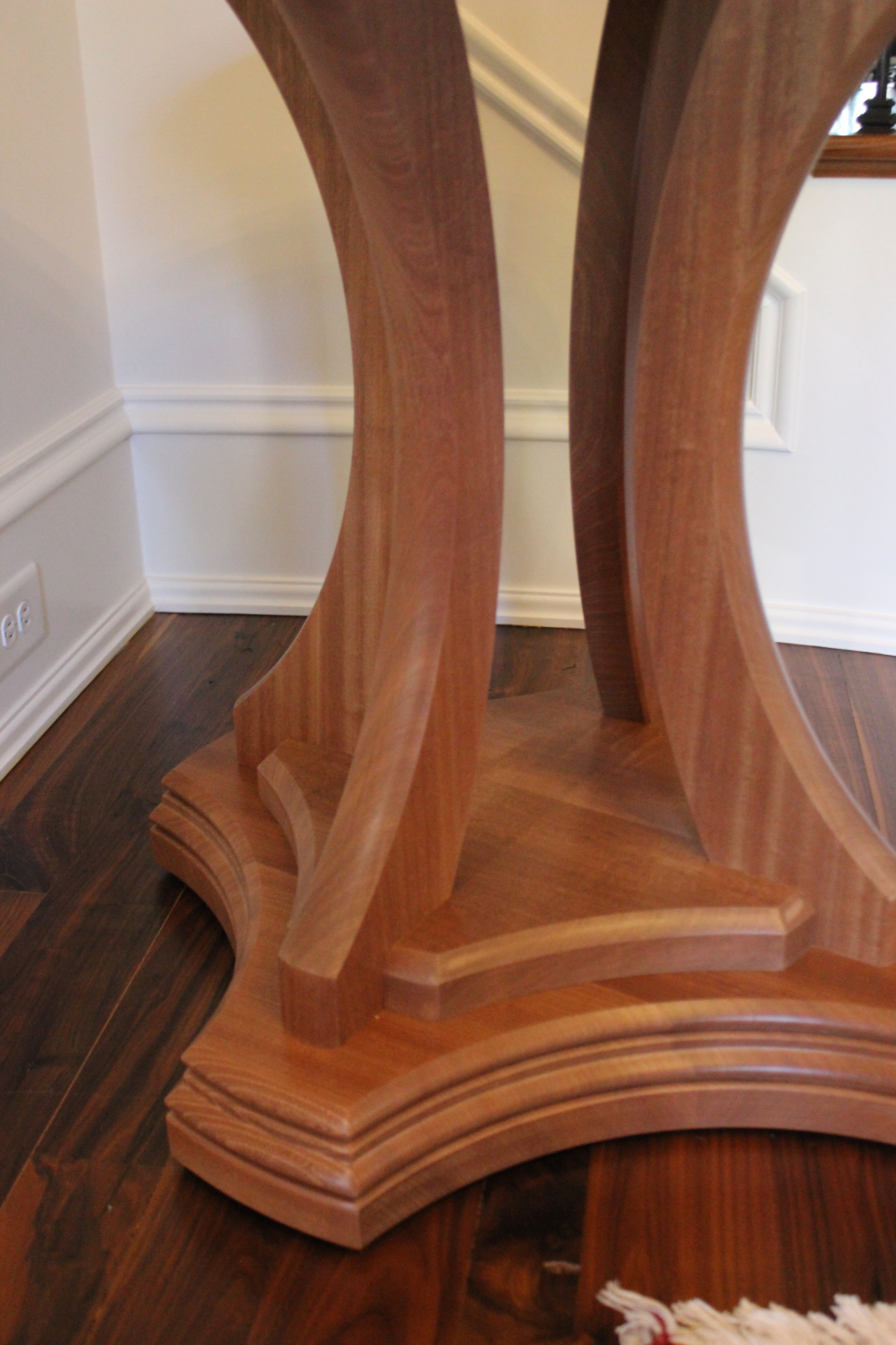 The Kaleido Entry Table showcases a variety of shapes and profiles to make a big impact in your entryway. A modified cross-shaped base incorporating convex and concave arcs accepts the gorgeous curved legs. Stacked, traditional edge profiles in the base flow up to the legs which feature a soft pillowed outer edge that complements the convex arc on the points of the base. Designed to accept a marble top, the top support features a table top edge to thin it down in appearance allowing the marble to take center stage. Shown in Sapele, the straight, ribbon stripe grain pattern contrasts the movement in the form of the table for an interesting effect.