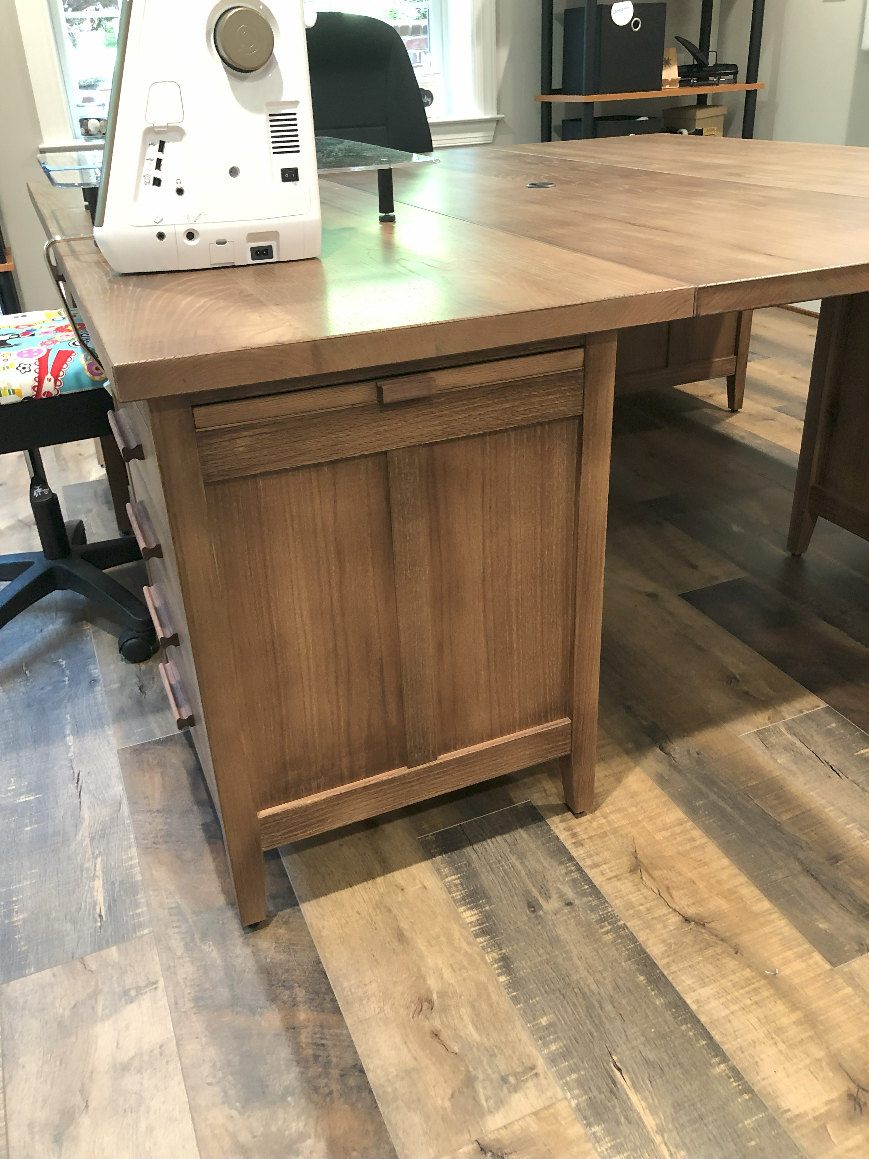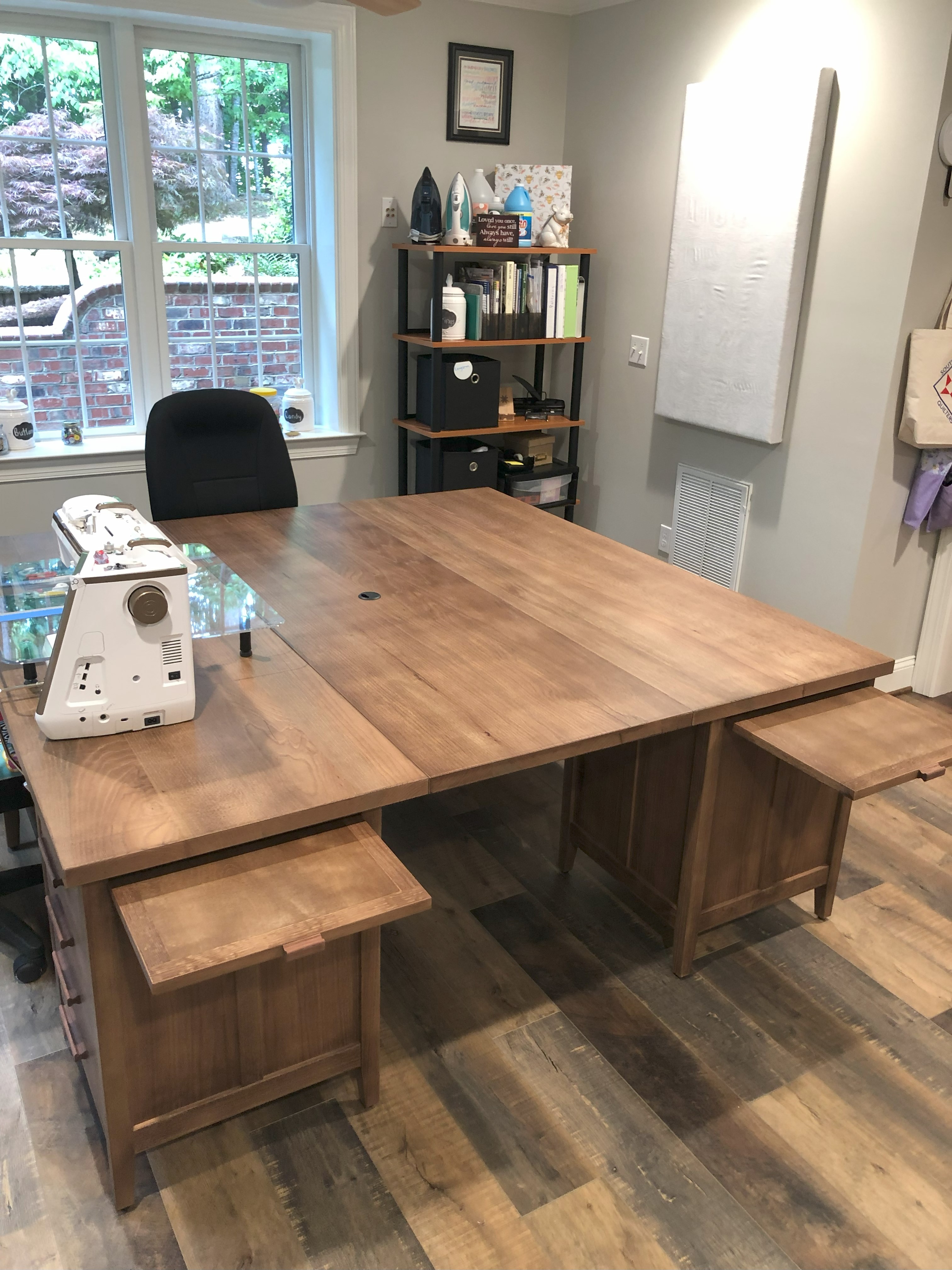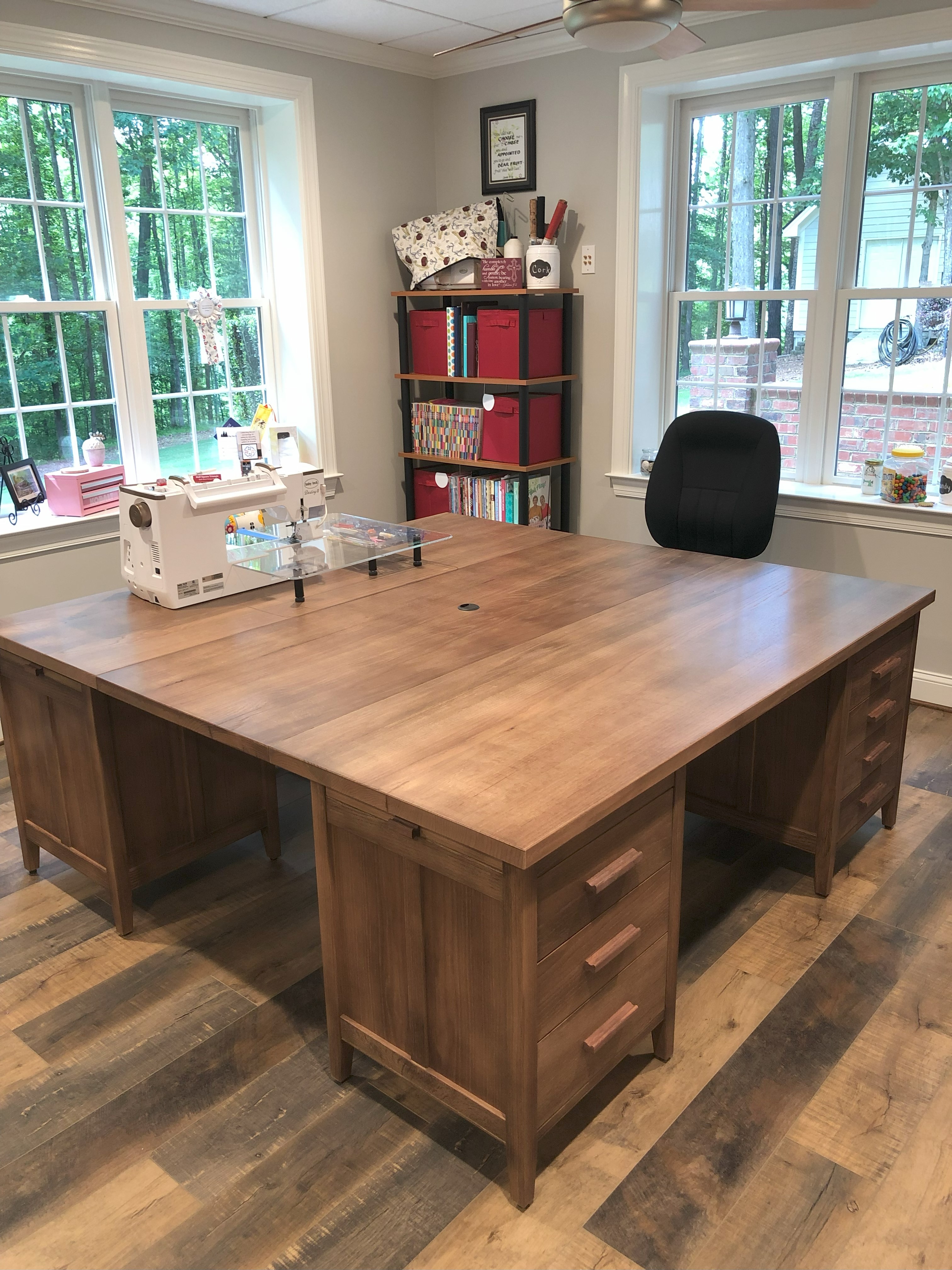 This shaker style sewing desk is the ultimate in luxury for a seamstress. Comprised of four cabinets, each with a bank of drawers and bread trays on each side, there is ample storage and functionality. Three solid wood tops provide an enormous worksurface and connect with knockdown joinery allowing it to be moved into place. Positioning the fours cases in the corners provide workstations for up to four people at once. The cabinets are constructed with traditional mortise & tenon and dovetail joinery for strength and longevity. Modeled after the famous sewing desks found in the shaker village, the design is simple and timeless with an emphasis on functionality.