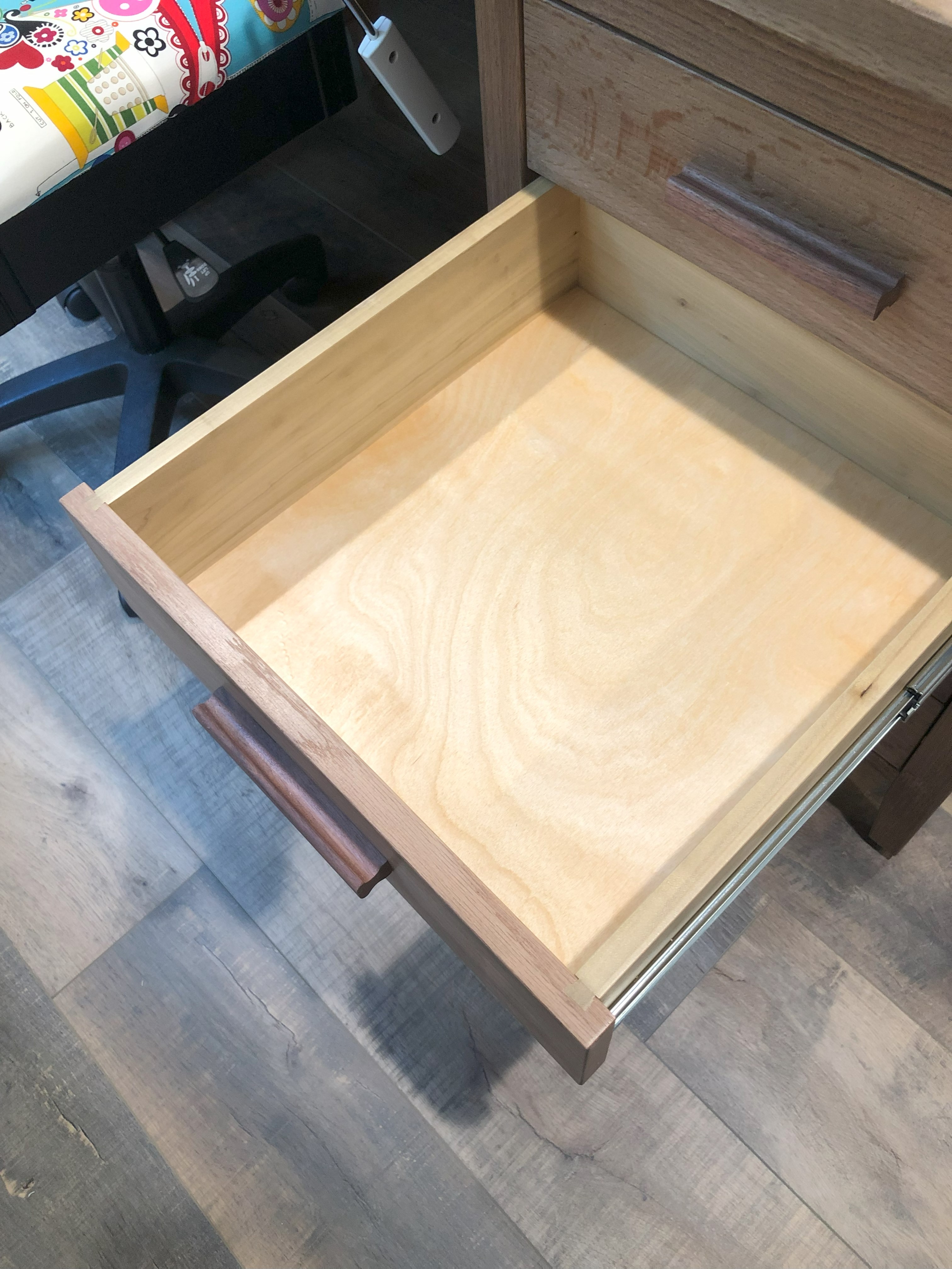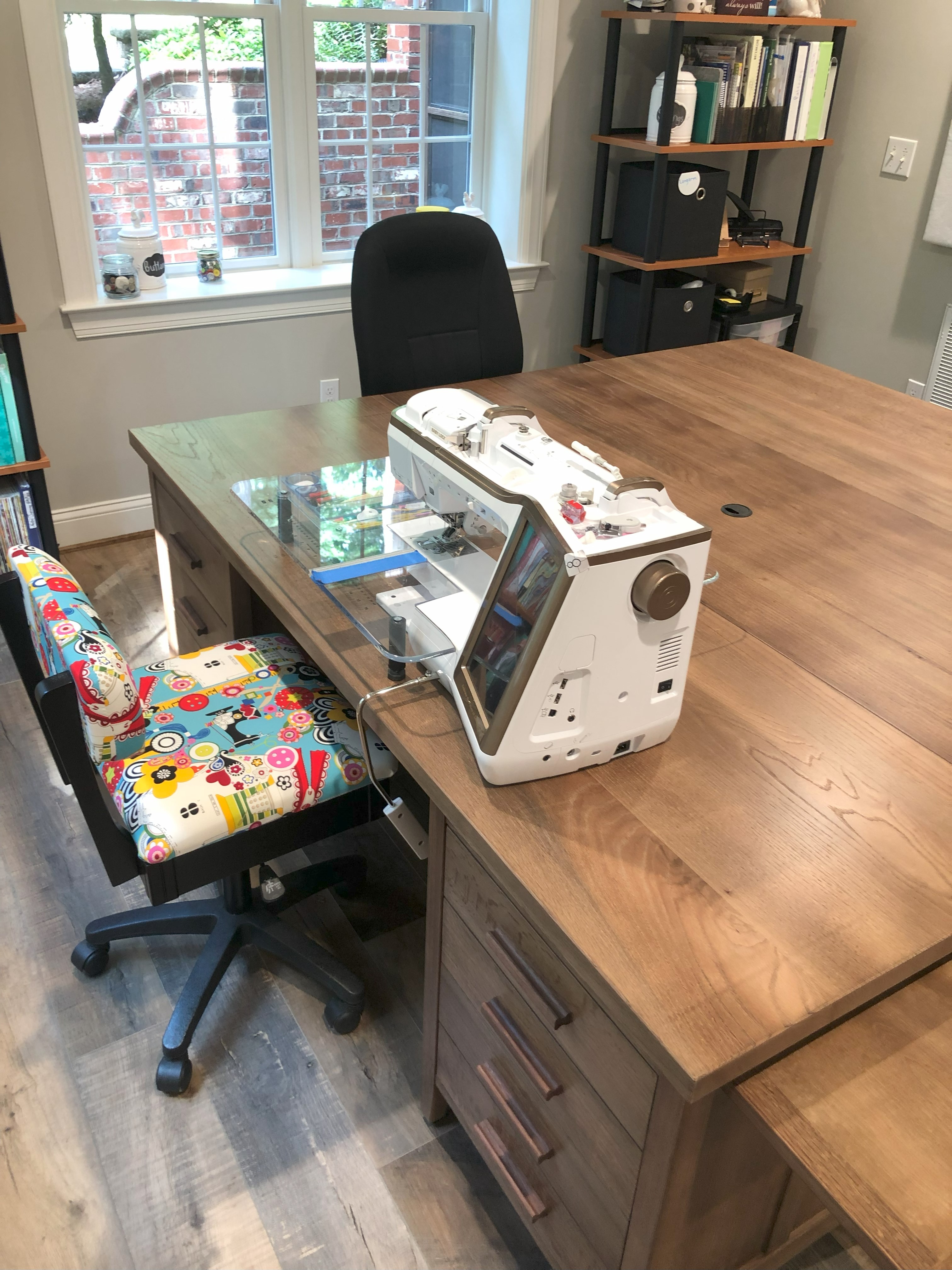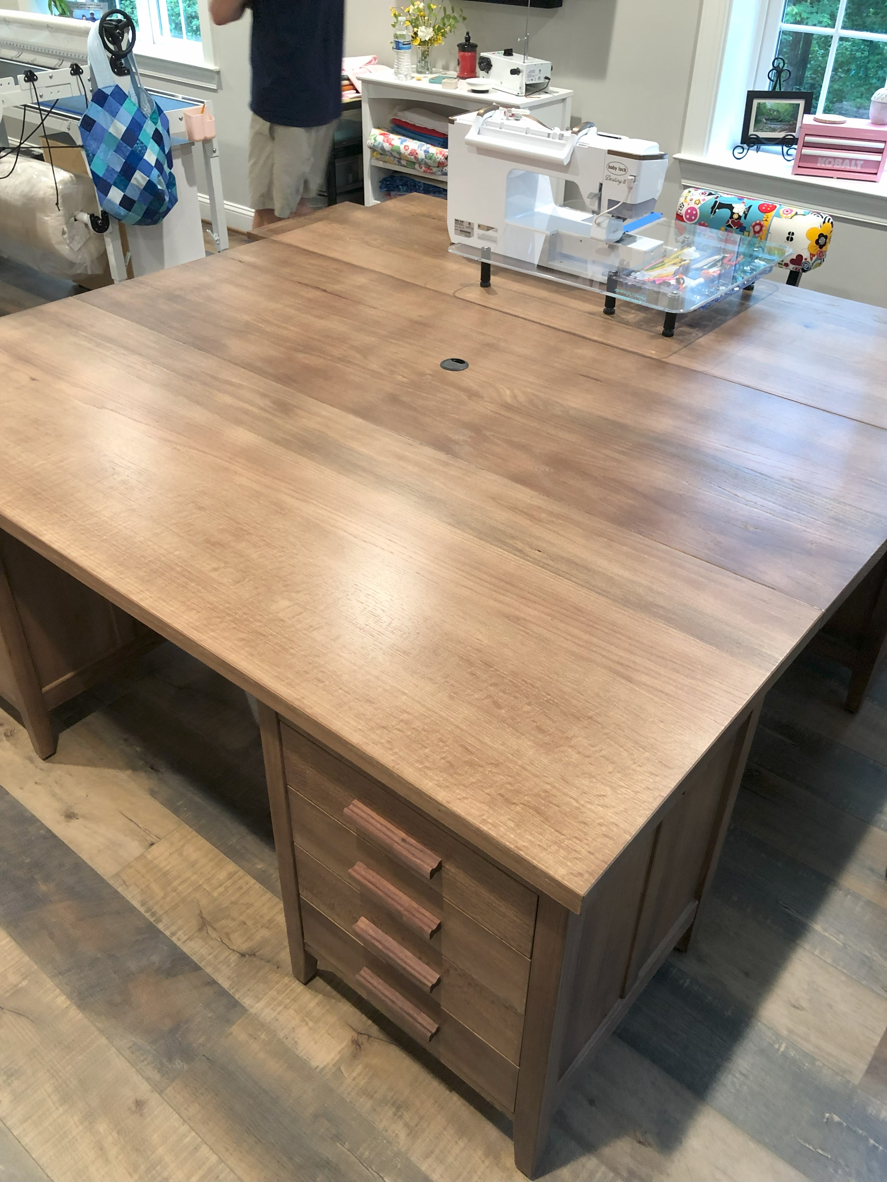 This shaker style sewing desk is the ultimate in luxury for a seamstress. Comprised of four cabinets, each with a bank of drawers and bread trays on each side, there is ample storage and functionality. Three solid wood tops provide an enormous worksurface and connect with knockdown joinery allowing it to be moved into place. Positioning the fours cases in the corners provide workstations for up to four people at once. The cabinets are constructed with traditional mortise & tenon and dovetail joinery for strength and longevity. Modeled after the famous sewing desks found in the shaker village, the design is simple and timeless with an emphasis on functionality.