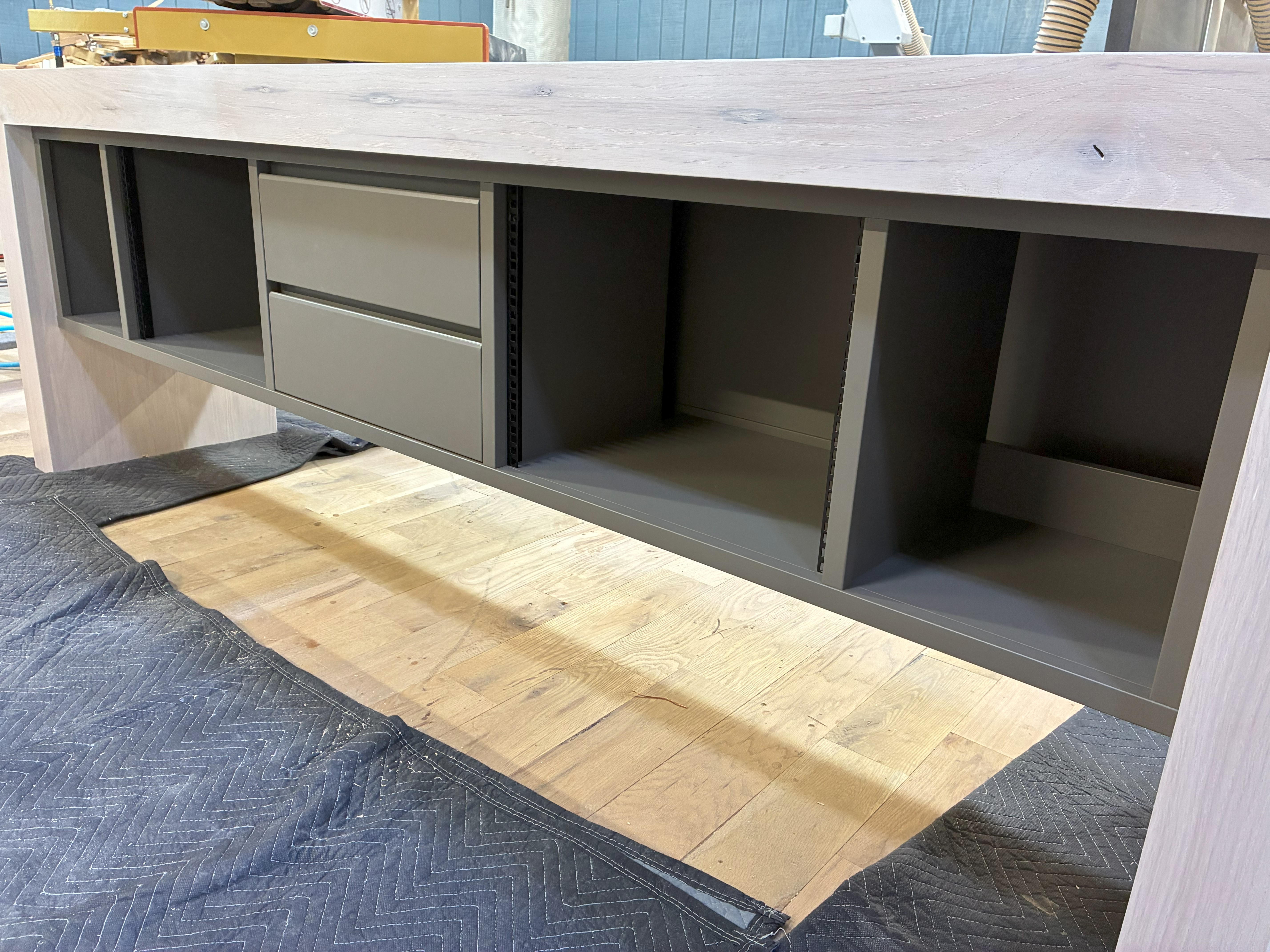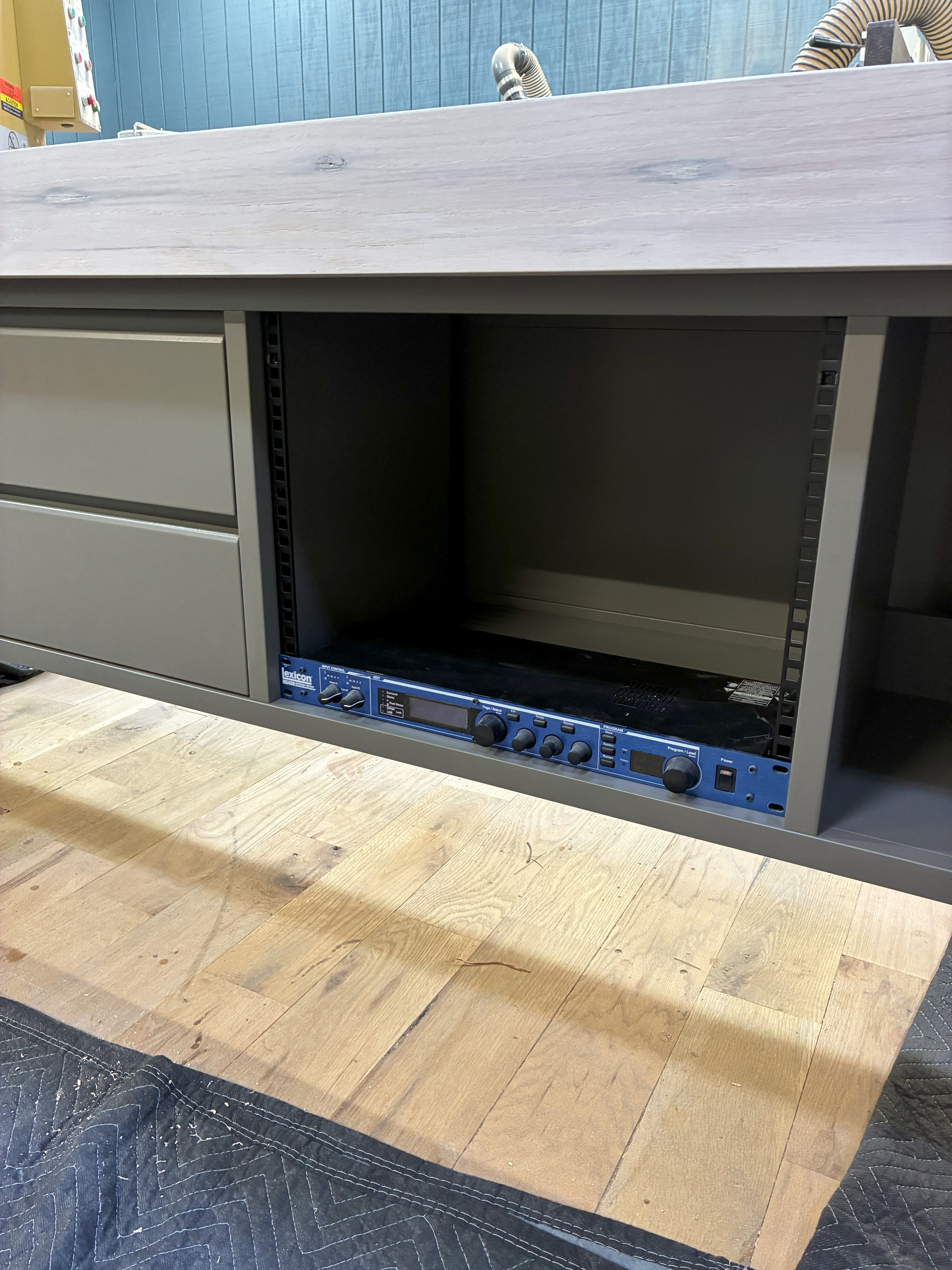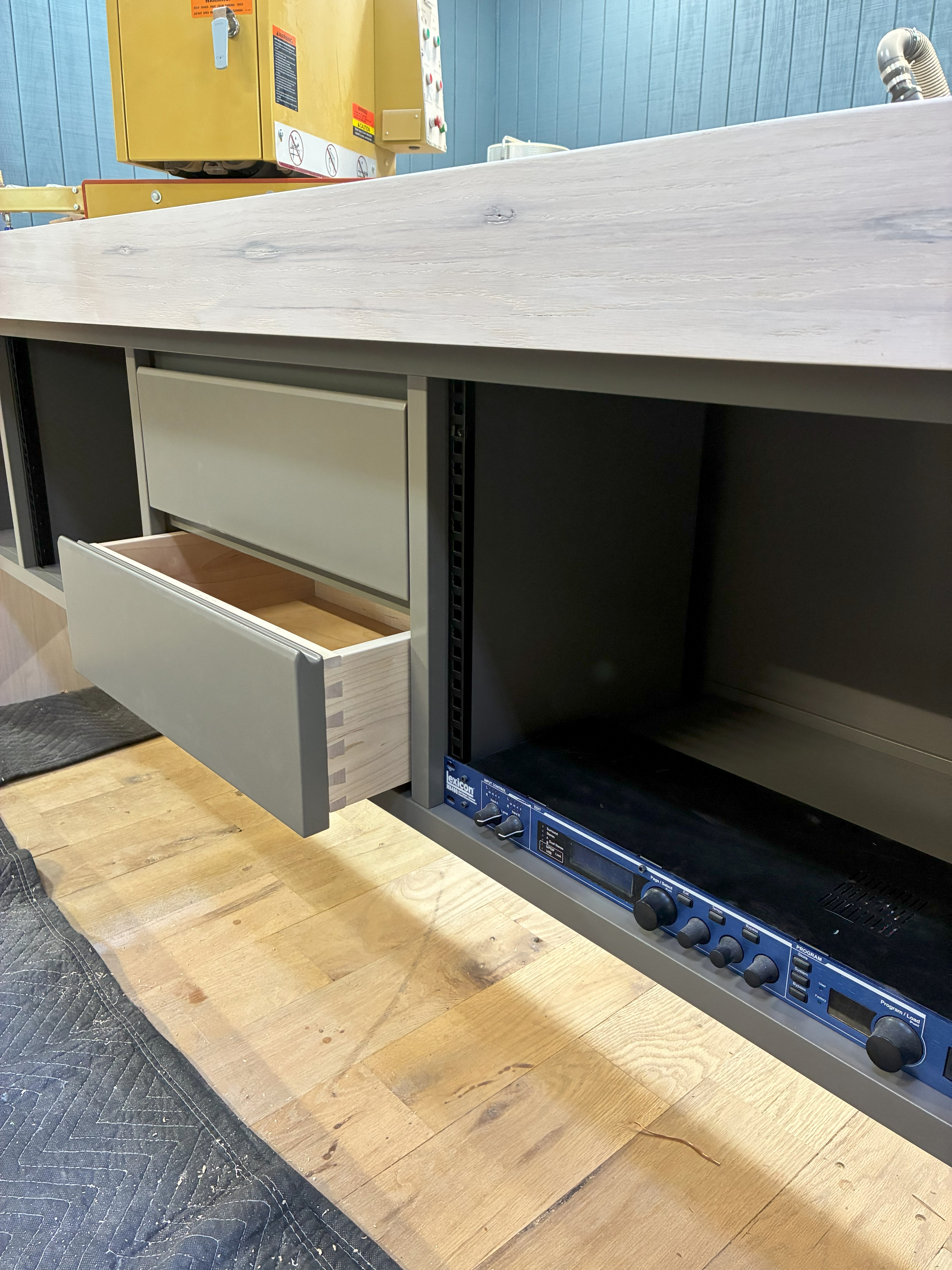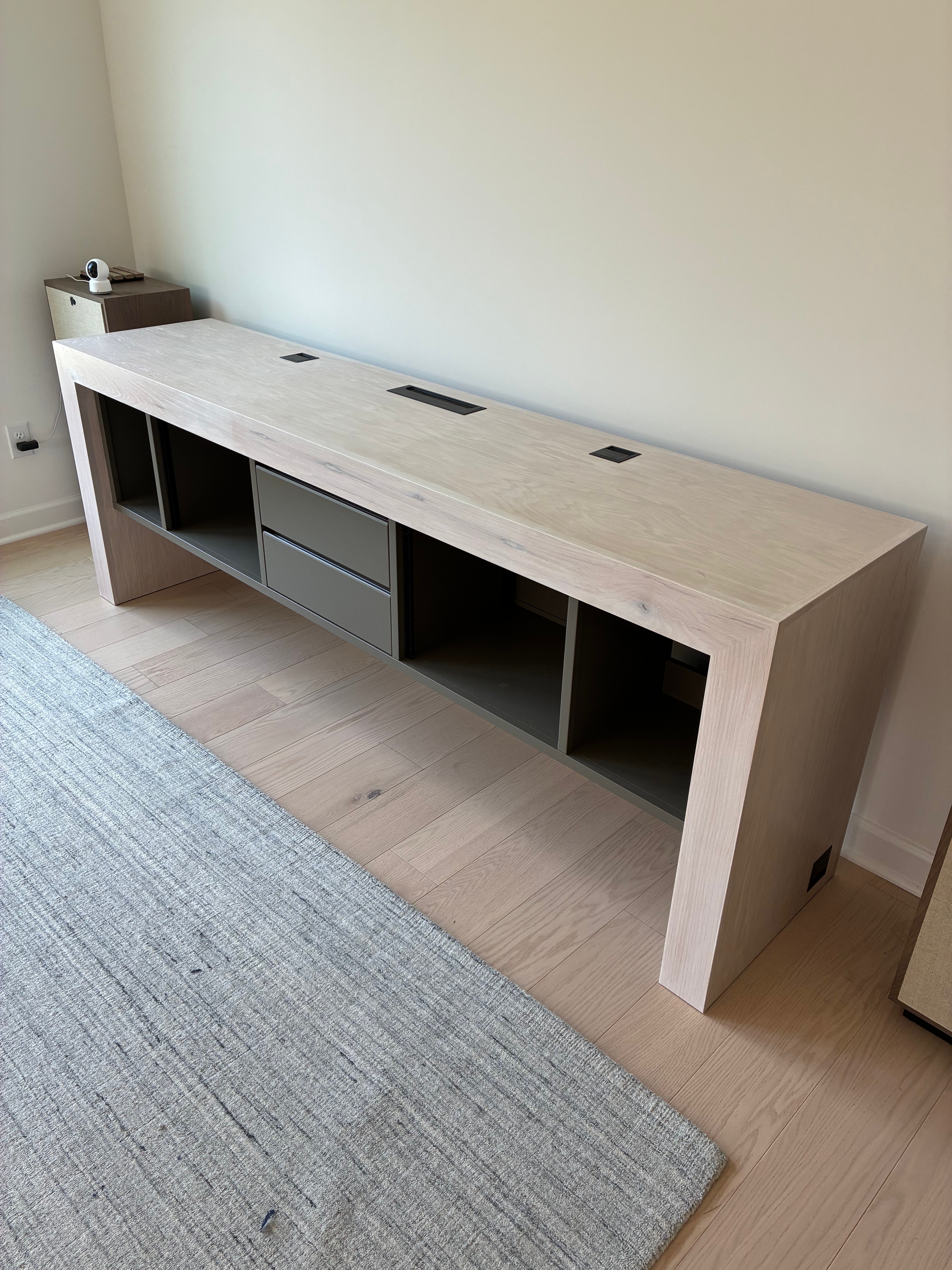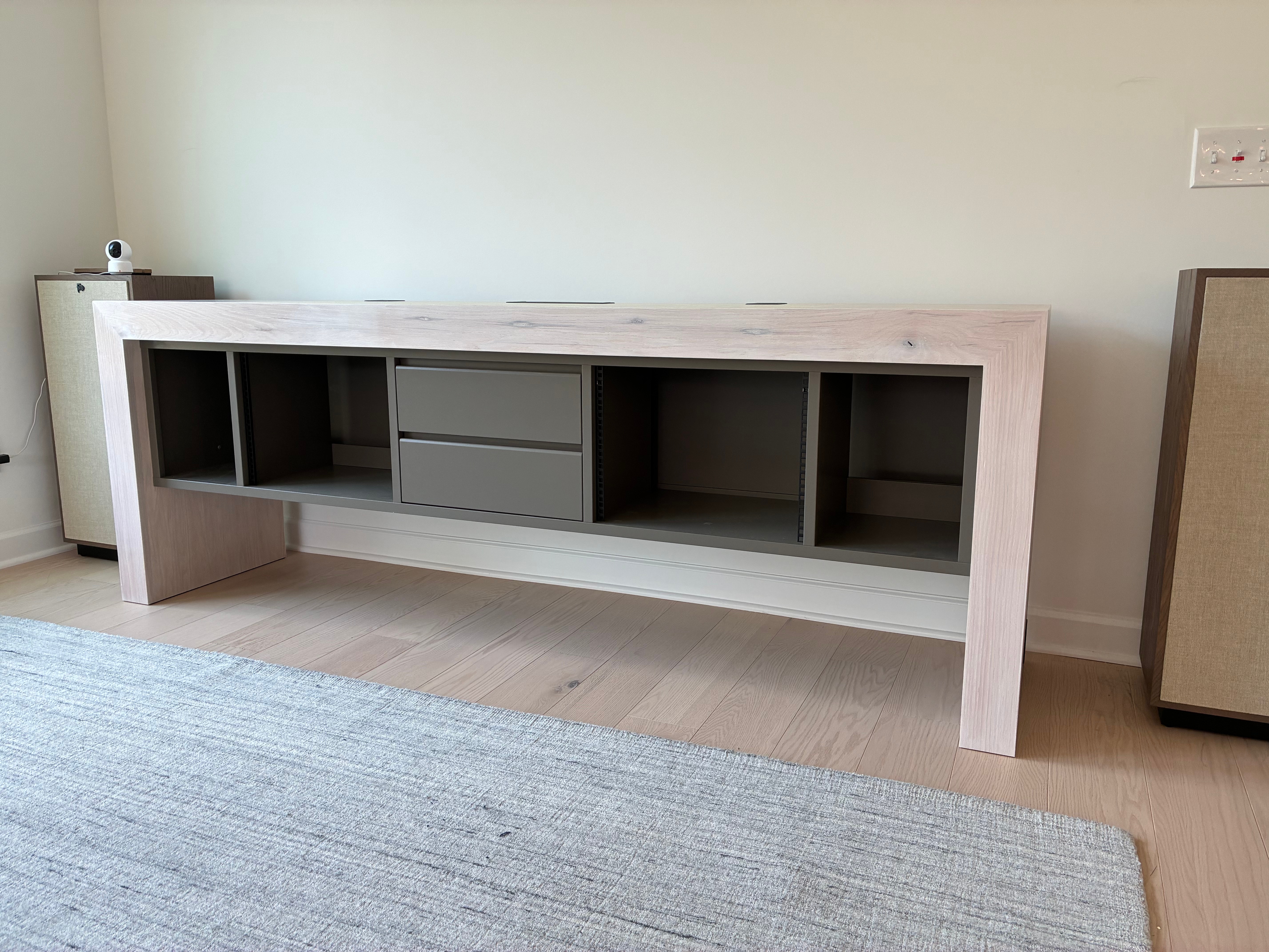 This modern media console is specifically designed to house DJ equipment. Strategically placed cord grommets on top lead to the cabinet where rack equipment will live providing a clean and neat solution for cable management. A center stack of dovetailed drawers with integrated drawer pulls and two cubbies for records provide stylish, thoughtful storage. Cable management continues inside the case work and down each leg continuing to store and hide the cables elegantly throughout the piece. A two tone finish with a deep grey cabinet and white washed oak table add modern, but approachable character. The soft tones are warm inviting while blending in well with a modern aesthetic.