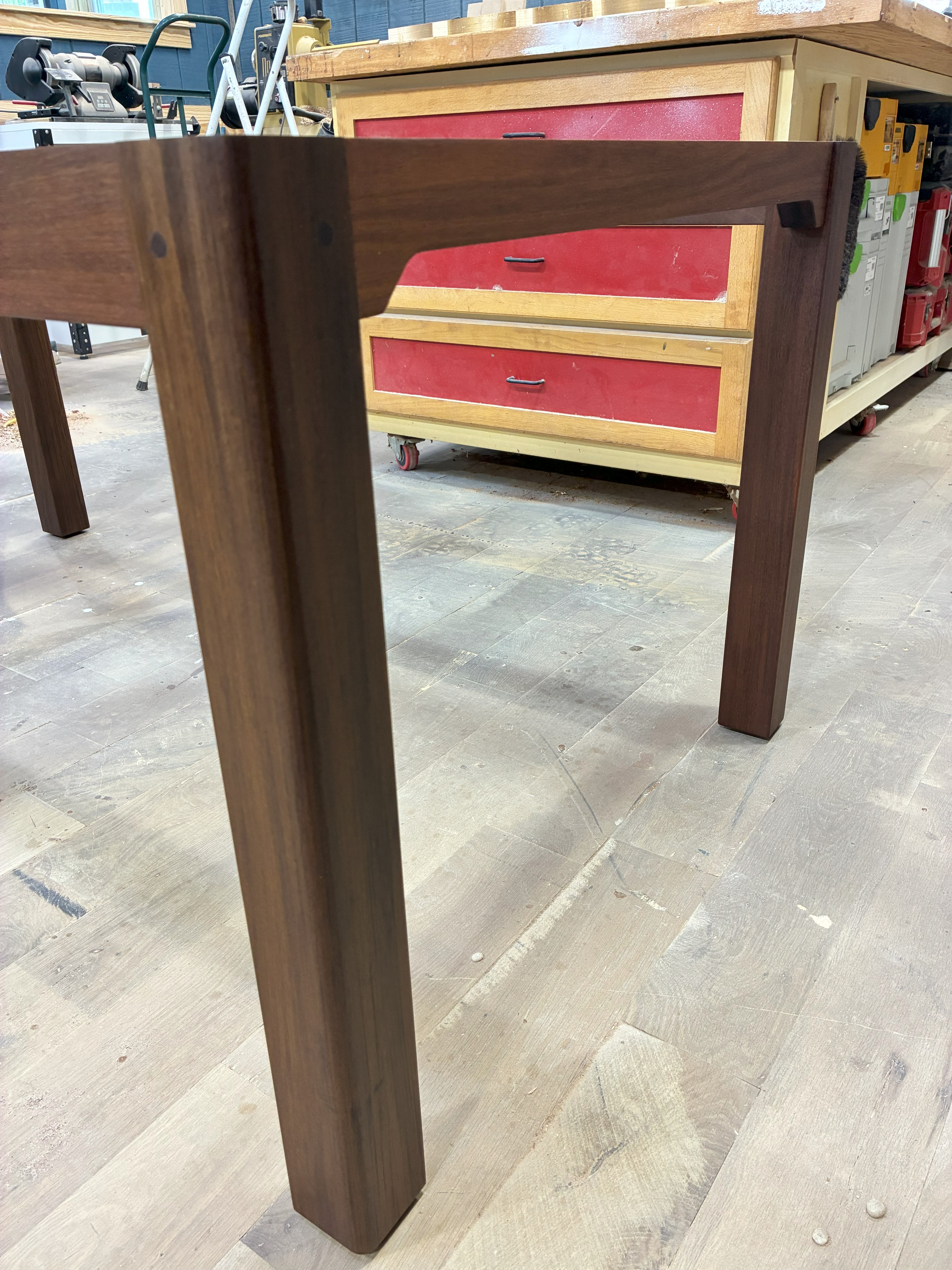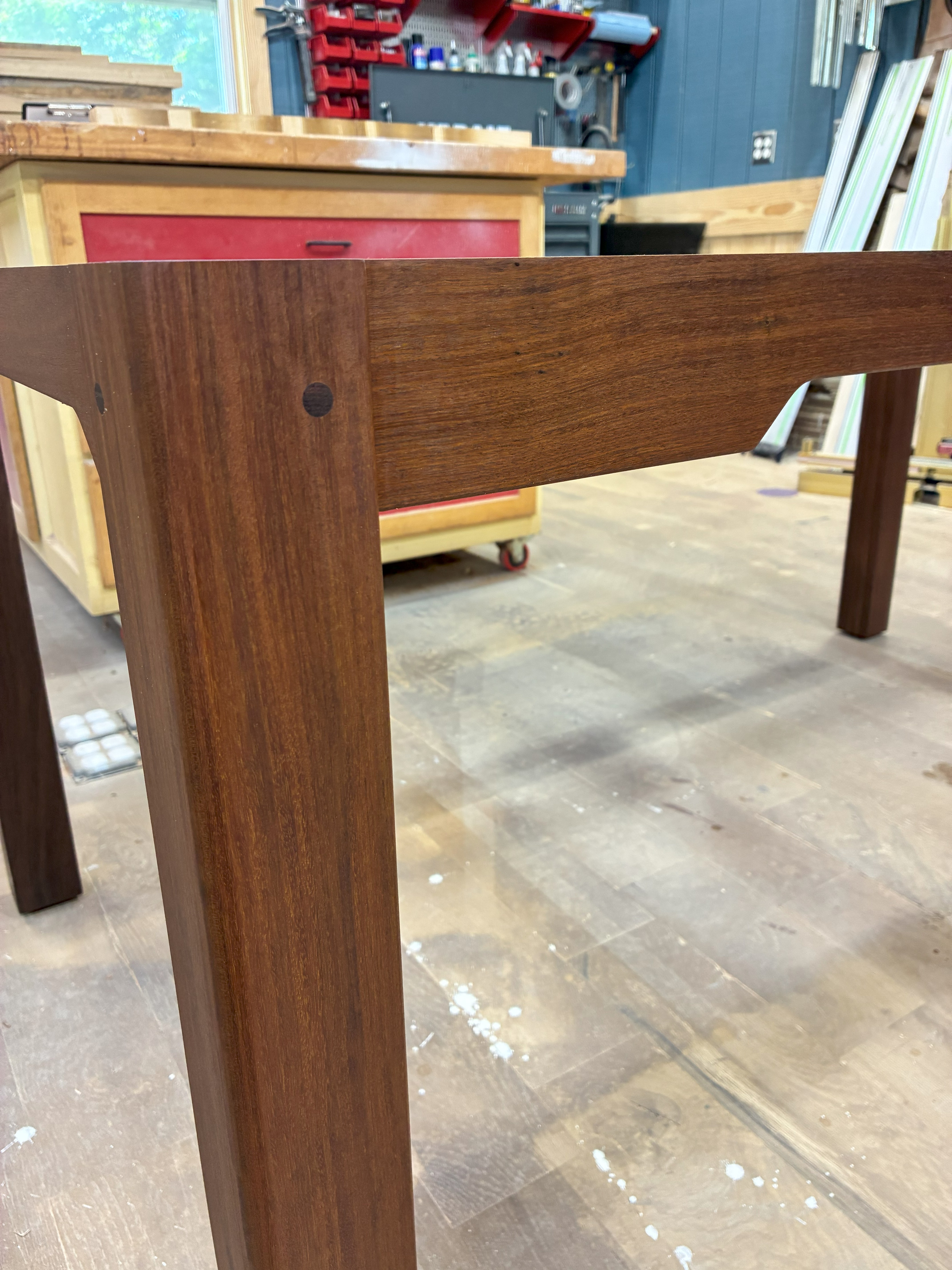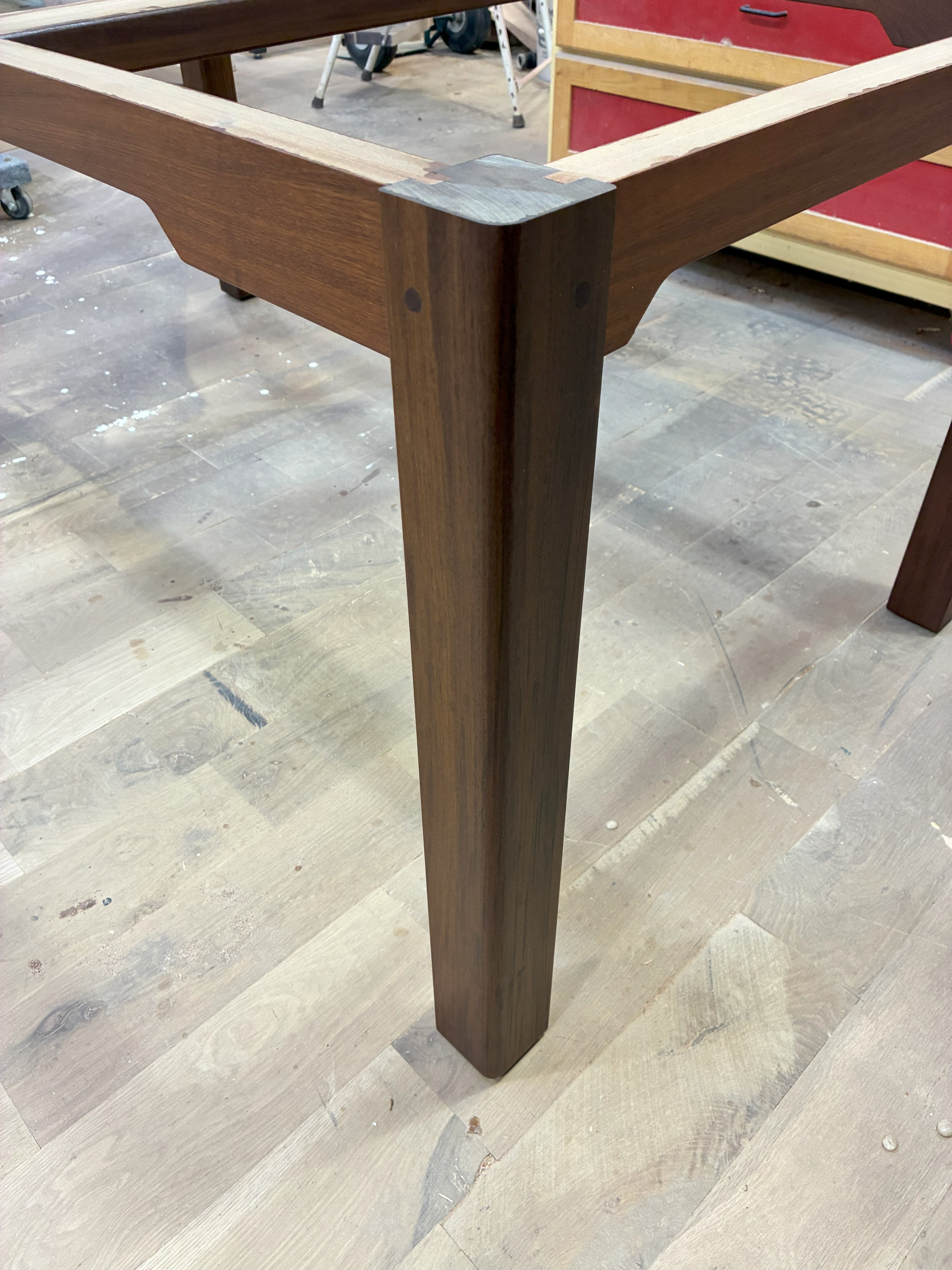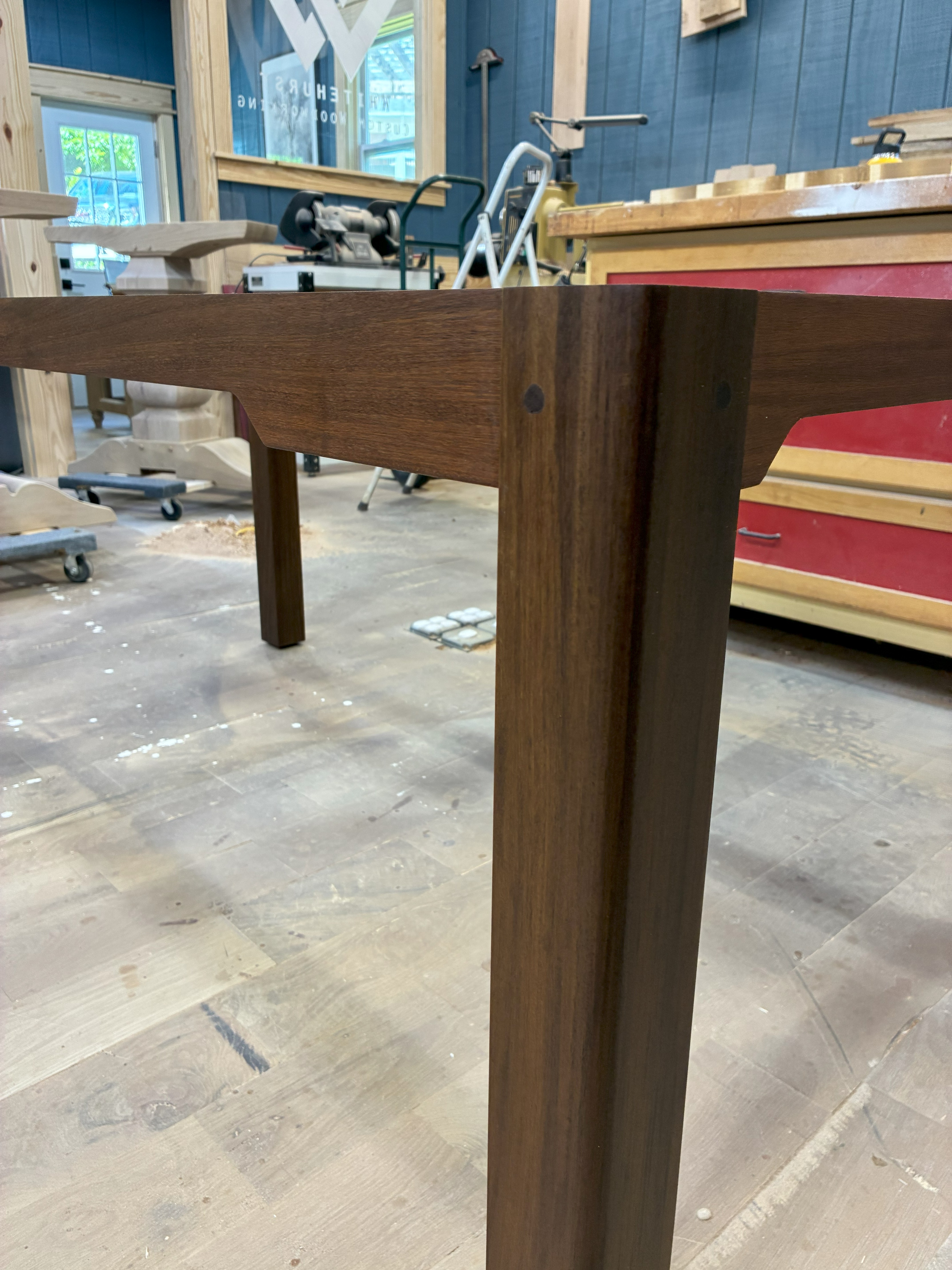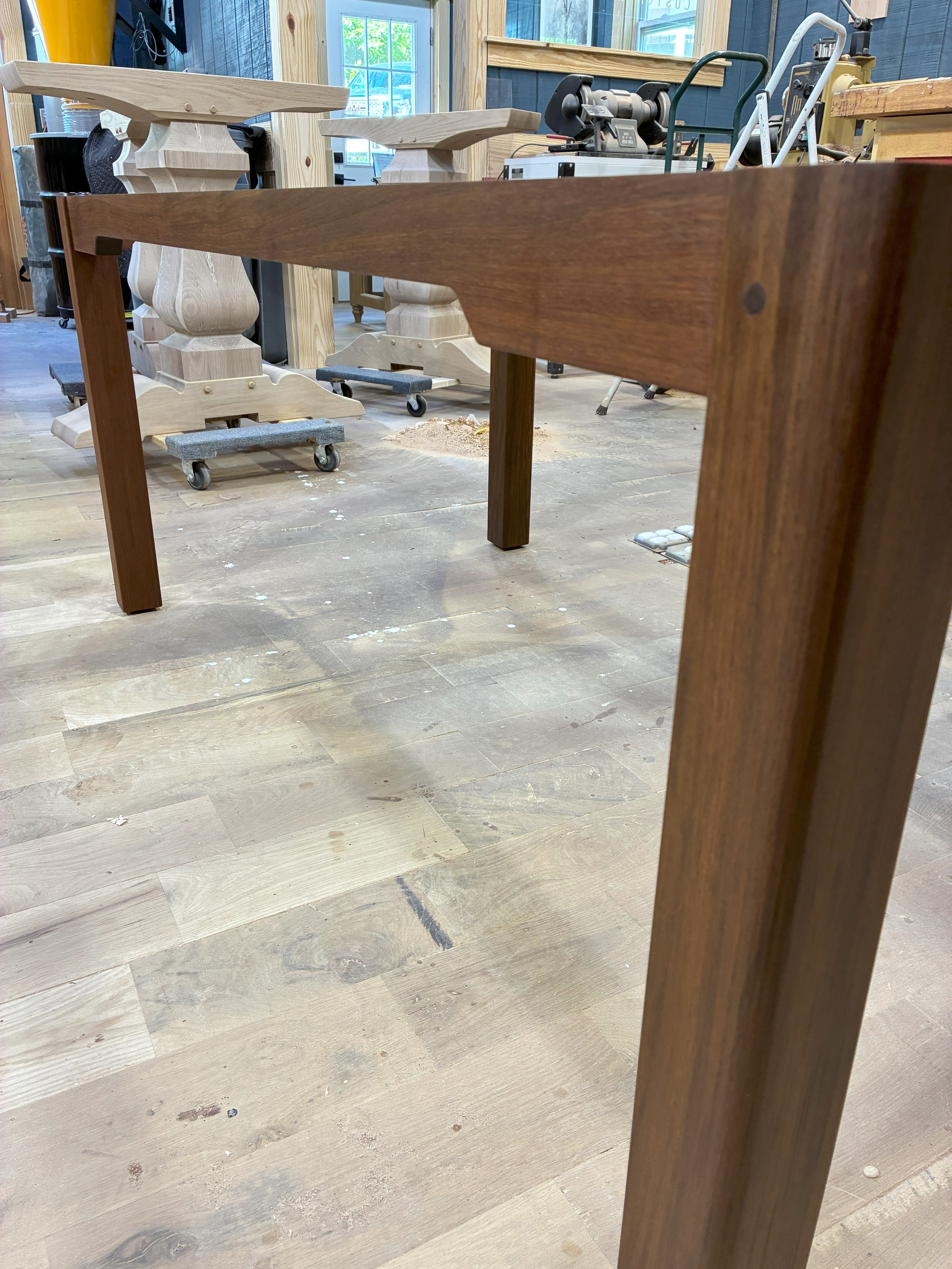This custom table base was commissioned with very specific requirements on the height and clearance under the apron. My client is shorter in stature and already has a set of patio chairs with arms. We needed a shorter table with room for the arms to clear, so we ended up with this lift detail in the apron to give us the strength at the joints and clearance for the arms. To me, this is the epitome of balancing form and function, and I’m honored my client trusted me with the challenge!