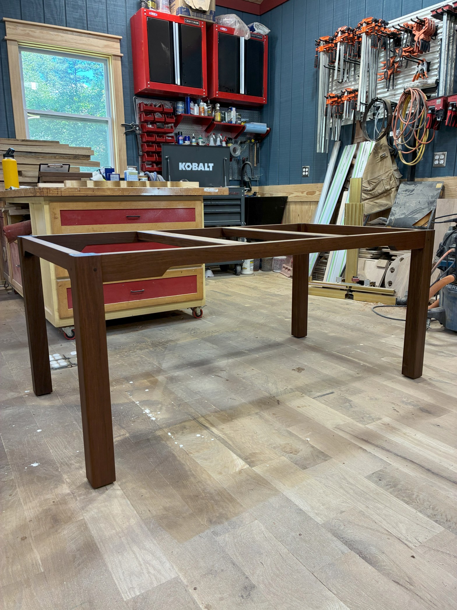 This custom table base was commissioned with very specific requirements on the height and clearance under the apron. My client is shorter in stature and already has a set of patio chairs with arms. We needed a shorter table with room for the arms to clear, so we ended up with this lift detail in the apron to give us the strength at the joints and clearance for the arms. To me, this is the epitome of balancing form and function, and I’m honored my client trusted me with the challenge!