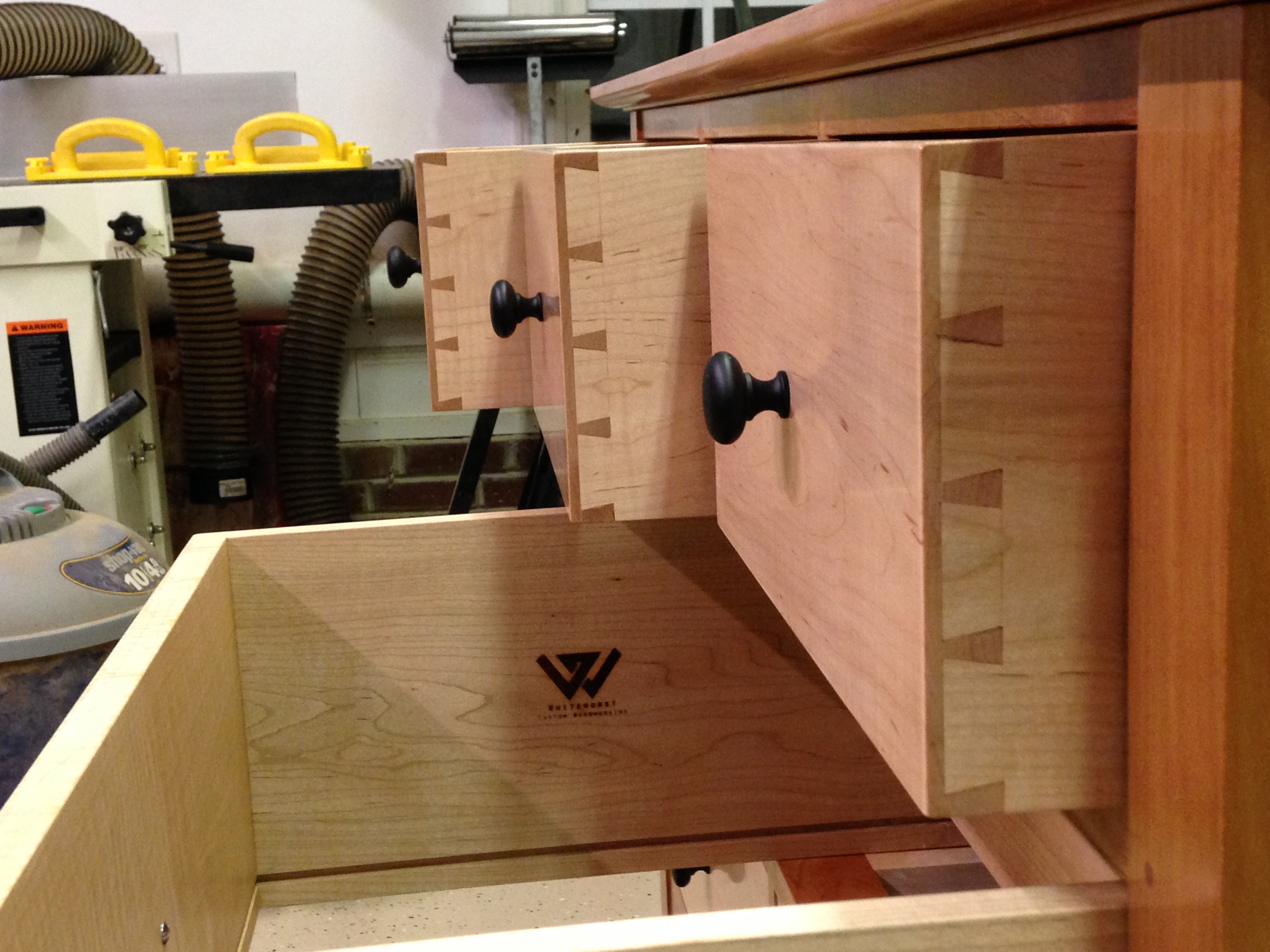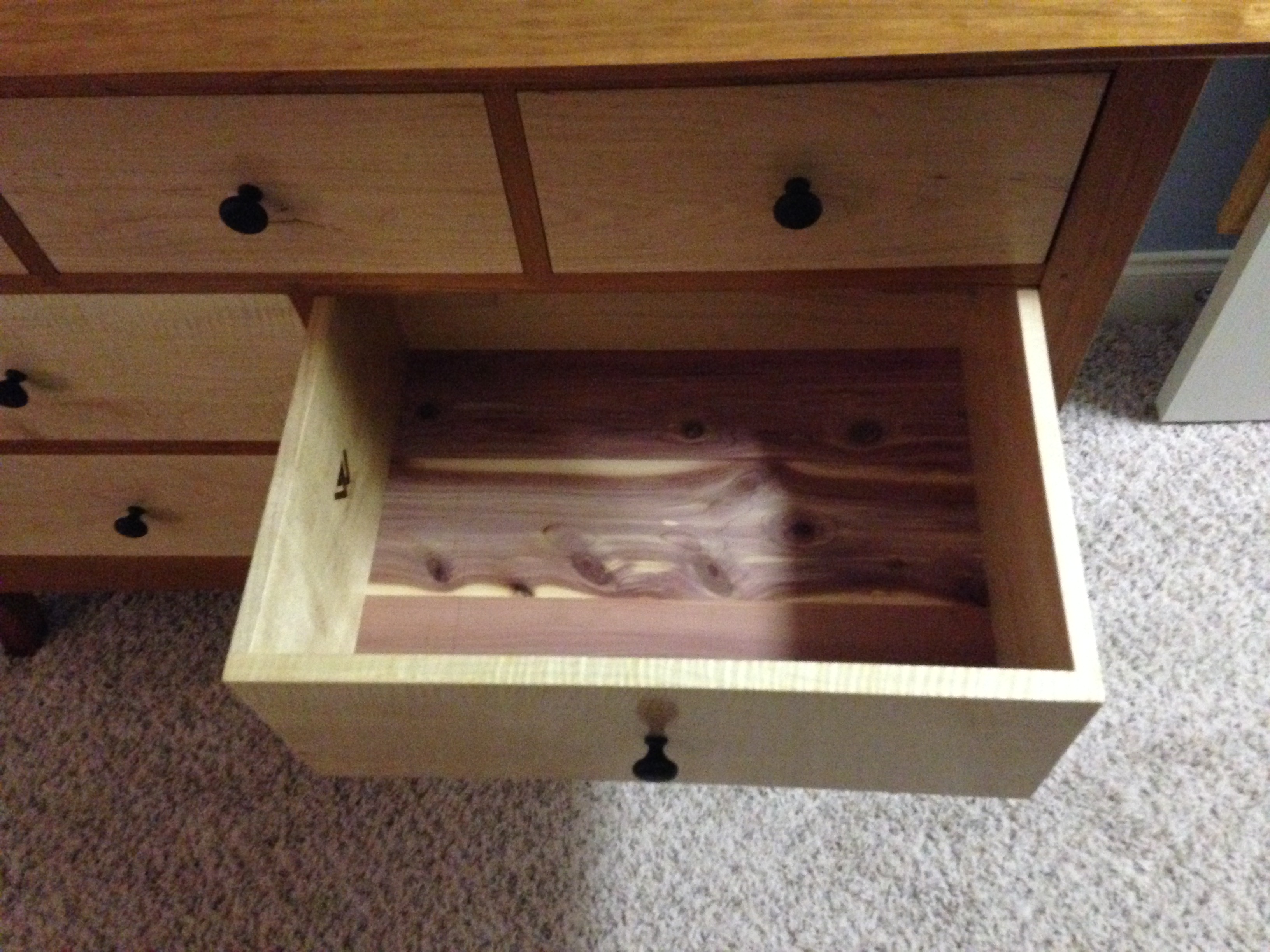 You may also consider the interior finish. This dresser features cedar drawer bottoms, but you may choose a simple secondary wood like pine or even plywood to save on cost. You may also consider lining the interior of the top drawers with flocking to store delicate clothing.