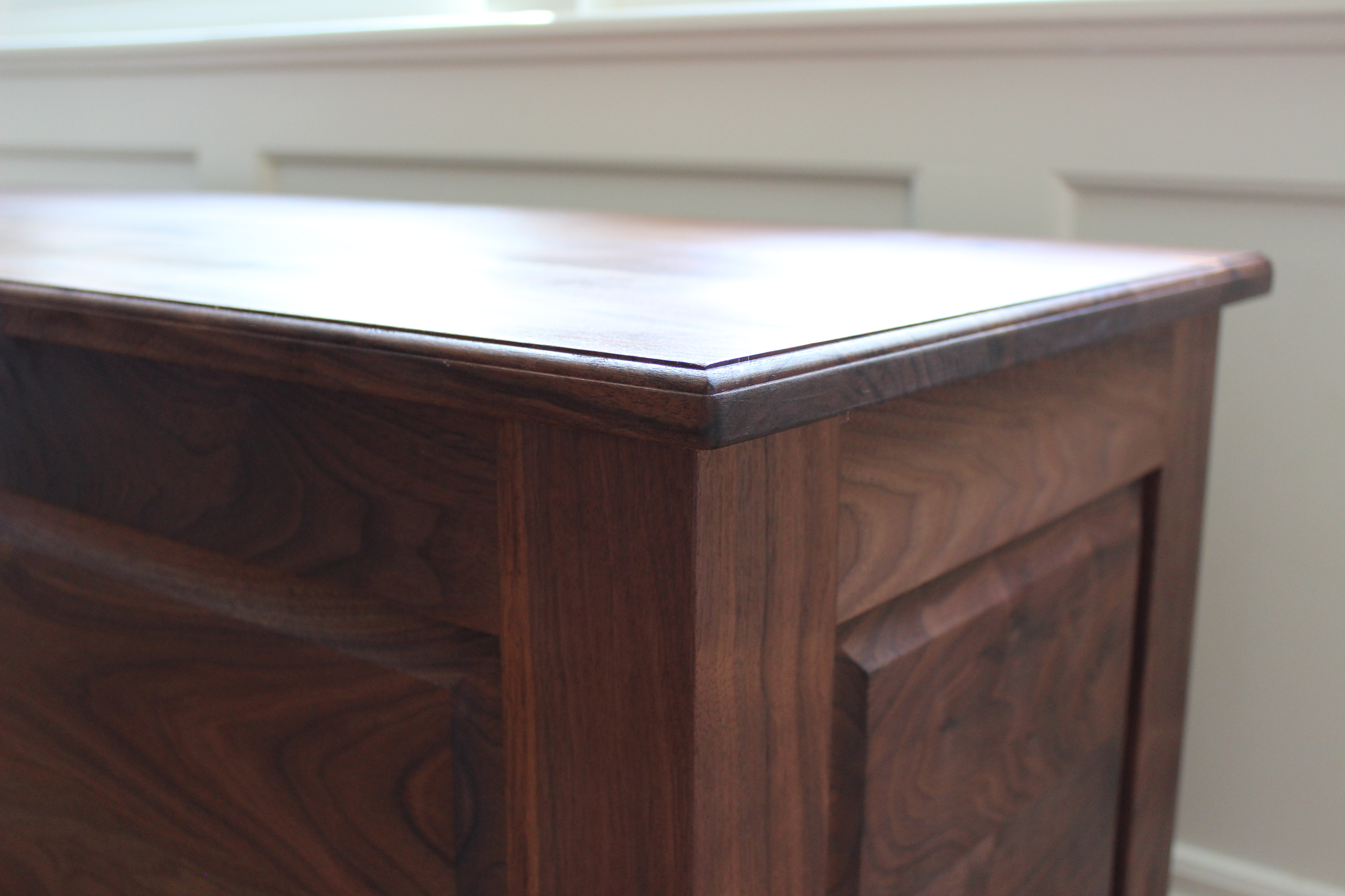 The overall design of this piece is Early American with the focal point being the raised panels creating the structure of the case. You will also notice ornate, yet reserved design elements such as the whimsical shapes in the base, the cove & half-round bead that creates the transition from the base to the case and the quarter-round bead around the lid.