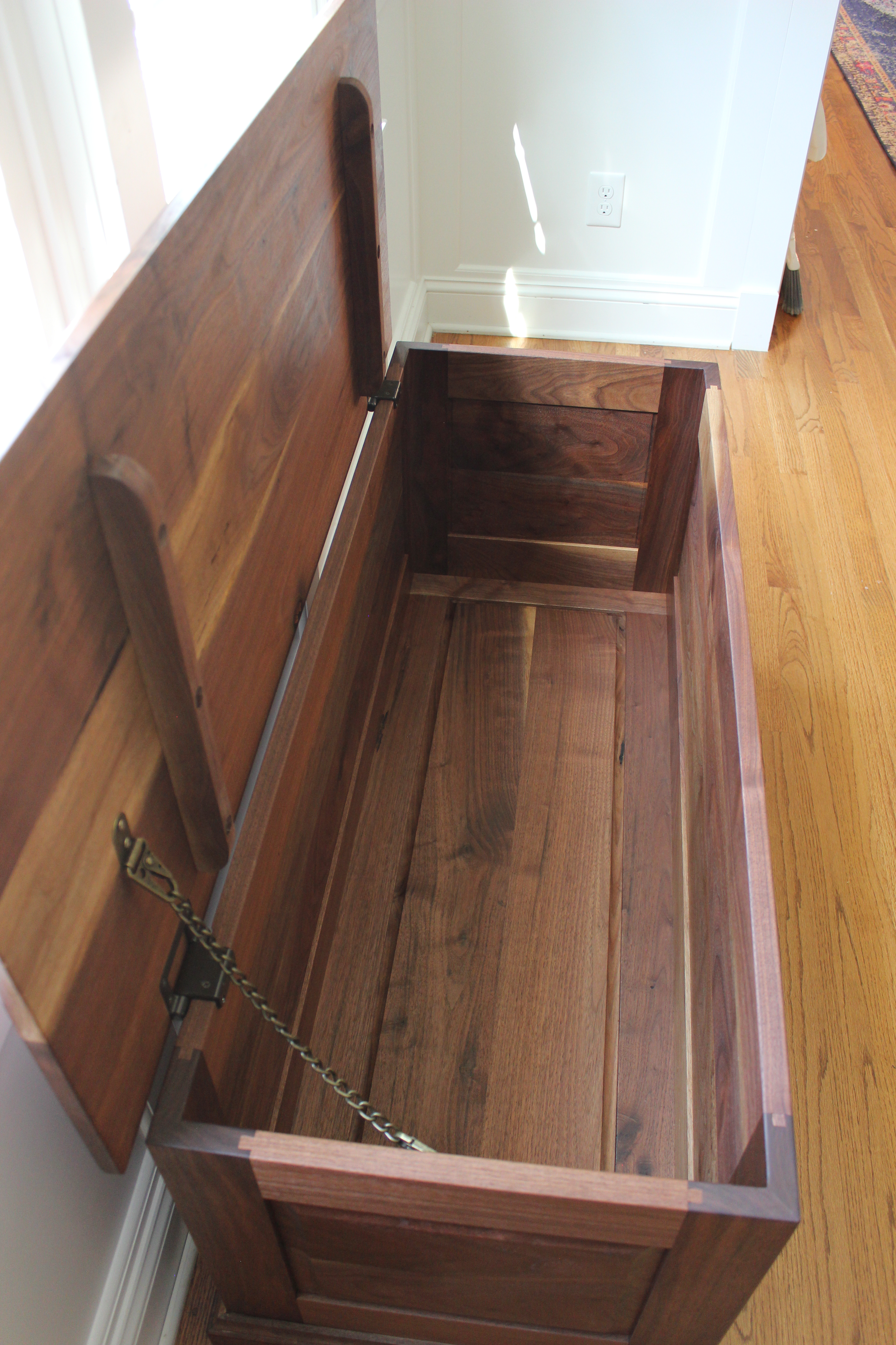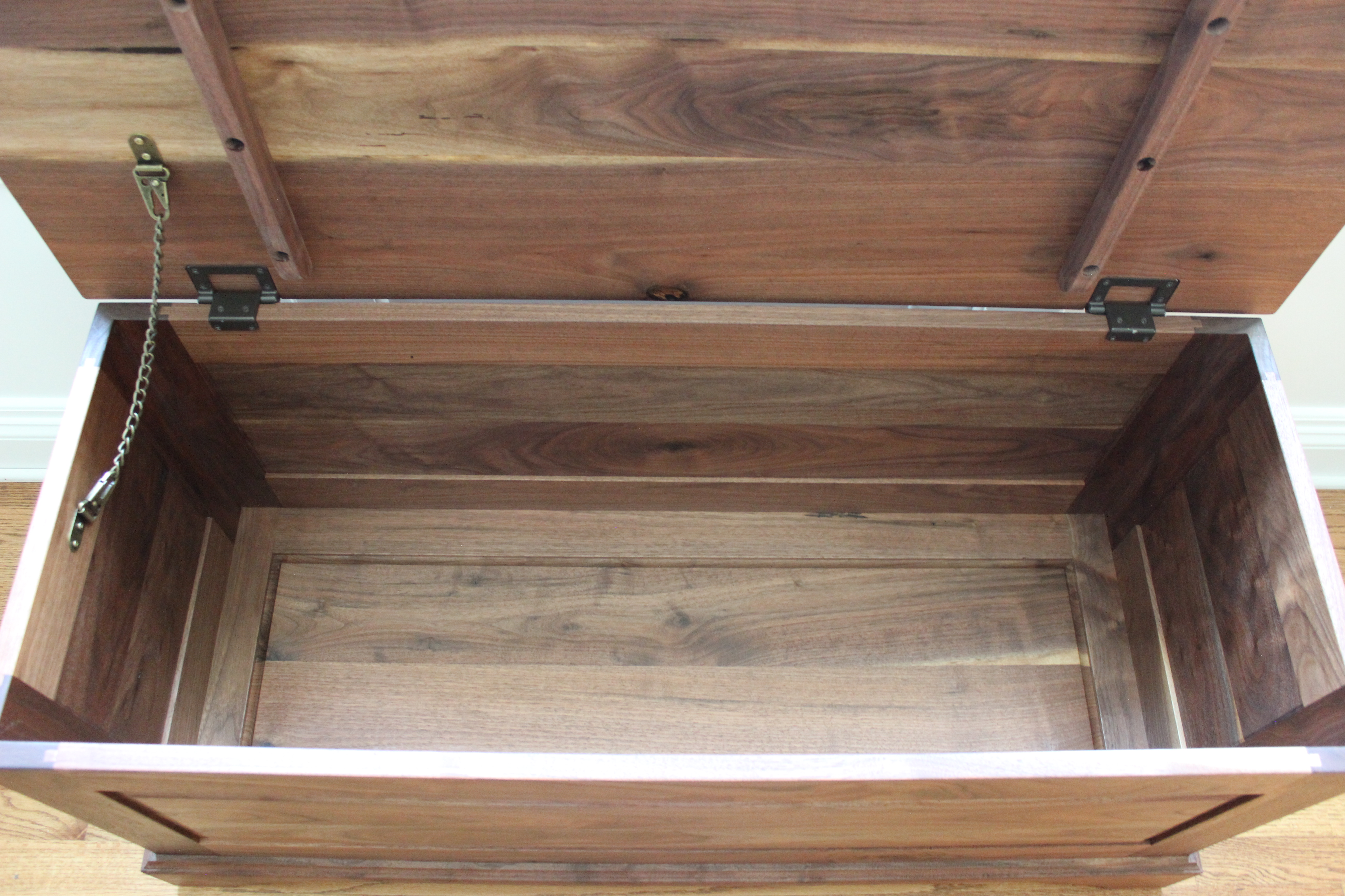 The main case is comprised of 5 frame and panels (with the fifth being the bottom panel). The frames are joined with a traditional haunched mortise and tenon joint. This joint allows for a deeper mortise and tenon for strength while filling the groove on the end of the frame where the panel sits. The front/back and sides panels are joined with a miter joint, and in this case the glue joint is a long grain to long grain glue joint making it extremely strong. For additional strength, the bottom is a frame and panel allowing it to be glued solid while allowing the bottom panel to expand and contract with the seasons. The apron base has a shallow rabbet on the inside that registers against the bottom to support the weight of the case. The top is a solid panel and stabilized with battens to help keep it flat over time. The top is attached to the case with Rockler’s Lid Stay Hinges which keeps the lid open while accessing the inside of the case.