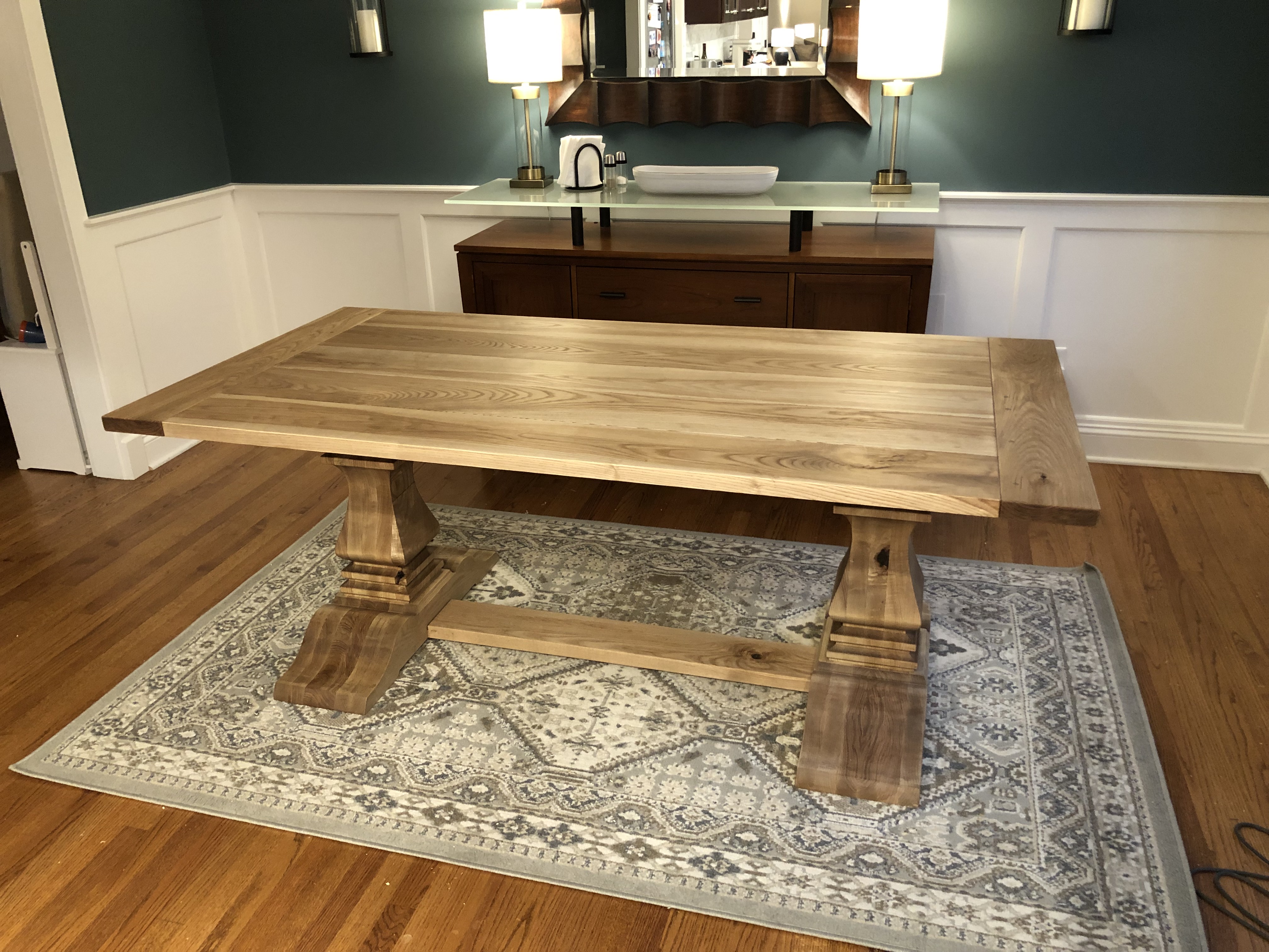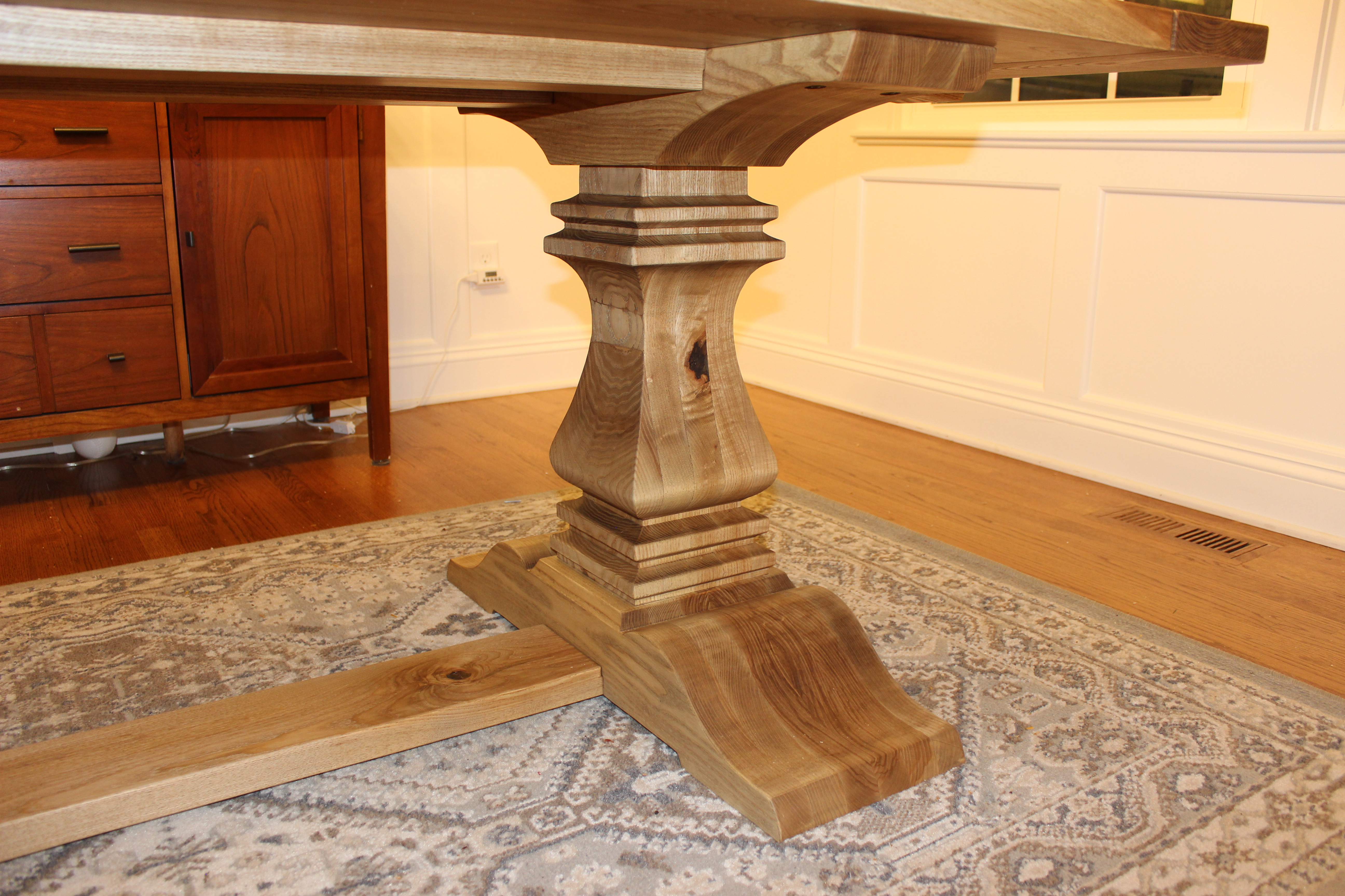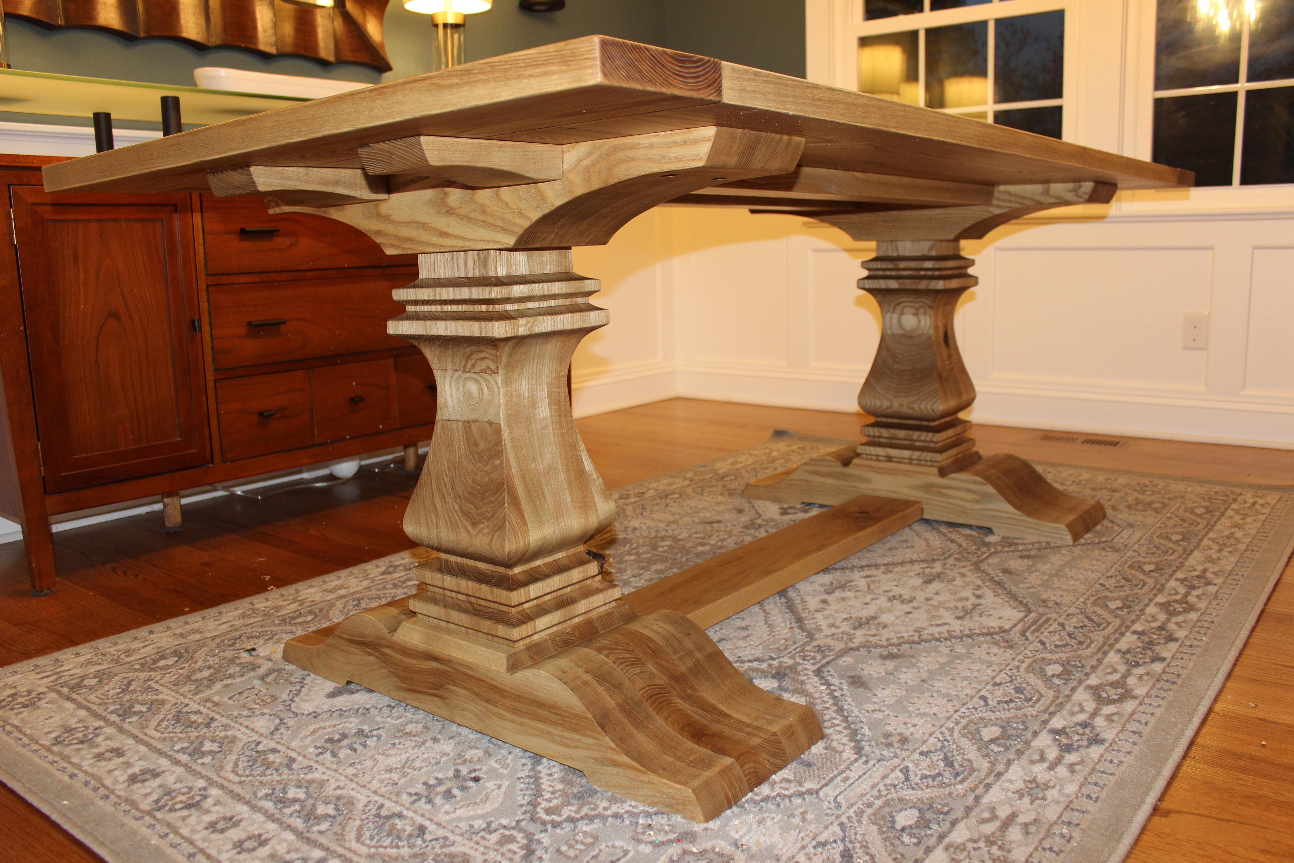 This table is a classic pedestal, trestle design. The two legs feature a wide foot for stability and a ton of character. Large flowing curves meet small facets to create an elegant, timeless design. The pedestal legs are made from three components joined together with large mortise and tenons for incredible strength. The base is completed with three trestles that are mortised into the feet and arms of the pedestals. These joints are secured with knockdown hardware to allow the piece to breakdown for easy transport.