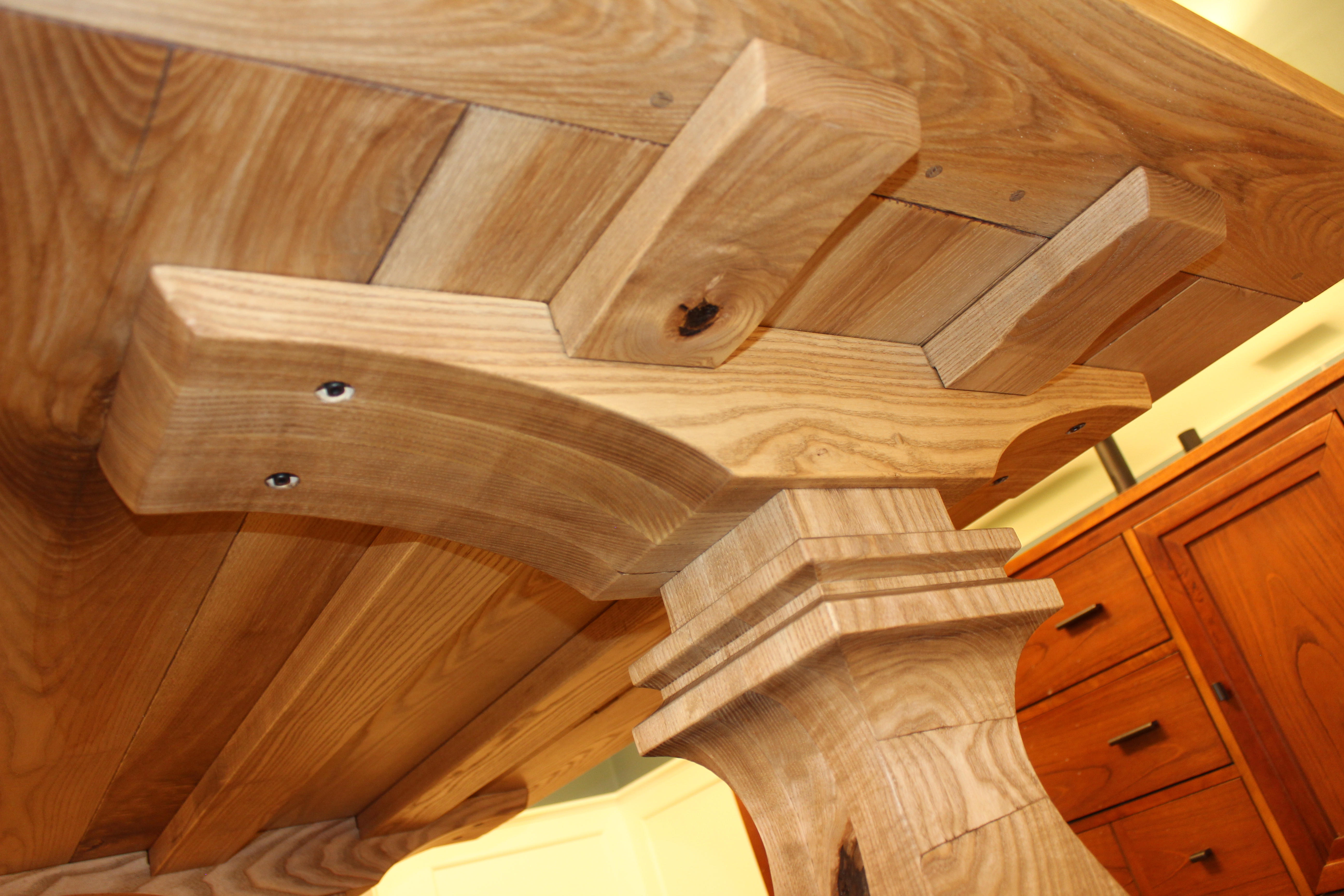 The top is a functional breadboard top. A board on each end of the top runs perpendicular to the field of the table to help keep the top flat over time. Five deep mortises accept the tenons formed on the end of the table. The center tenon is glued and a drawbored mortise and tenon hold the others tight to the field allowing the table to expand and contract with the seasons.