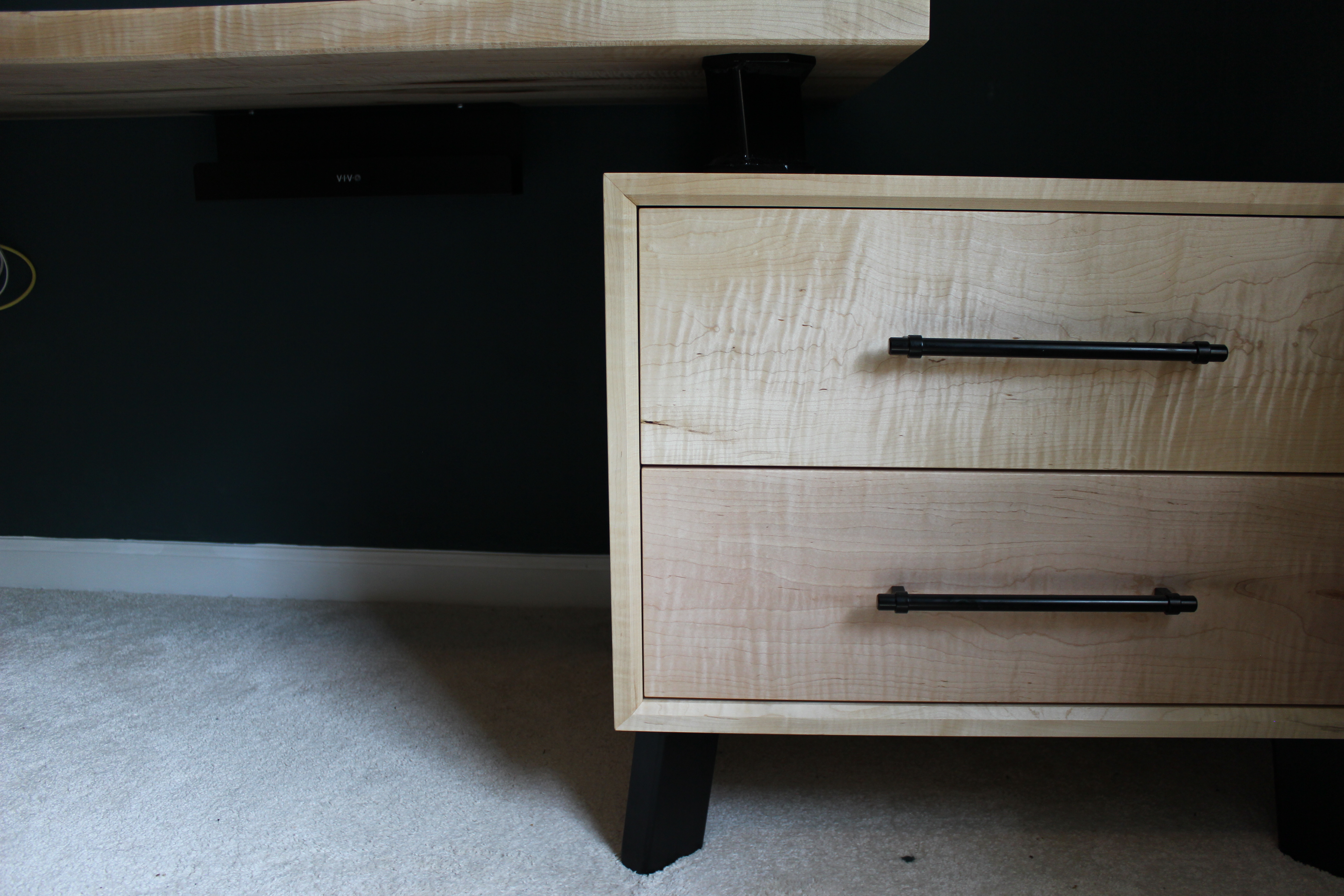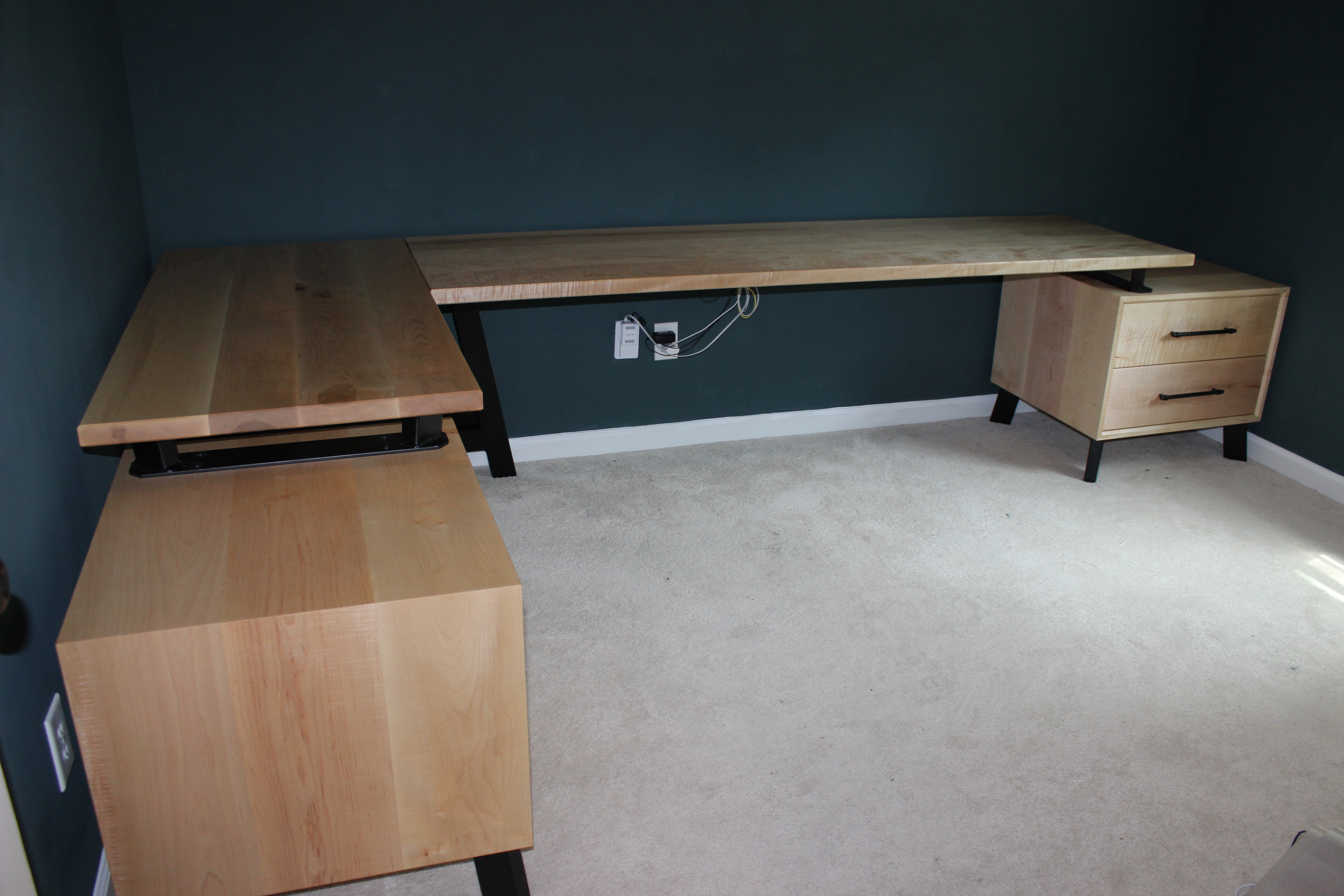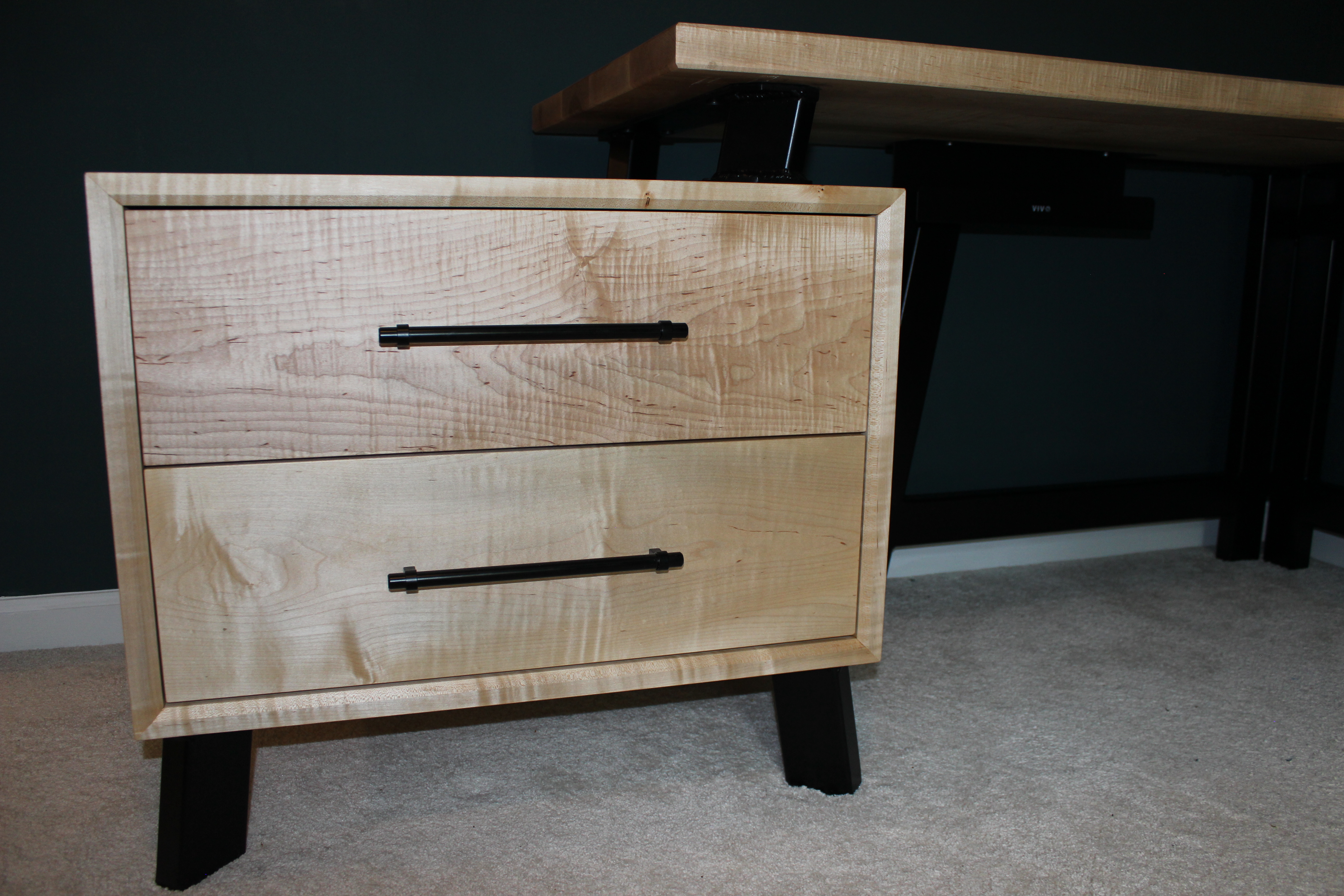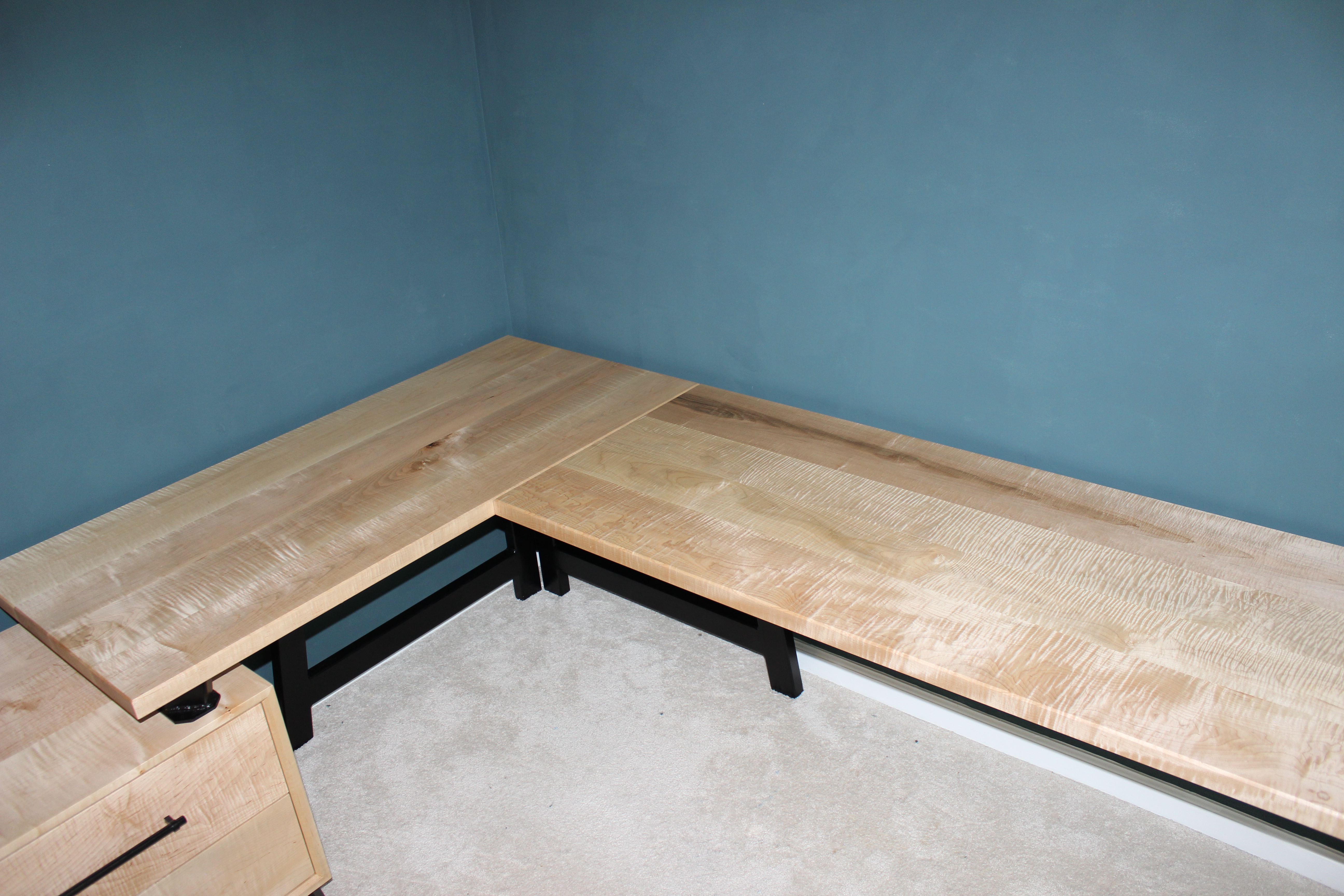 The Fortitude Desk blends wood and steel to create a comfortable, sturdy workspace. Mitered cases rest on angular steel feet giving this contemporary design a solid foundation. Two full depth drawers in each case provide ample storage. Angled steel risers lift the desktop above the case creating interest and additional options for your organizing items. When configured as a corner desk, angular steel legs support the corner for an open air, minimalist design. A 1 1/2″ solid wood top provides a beautiful, sturdy worksurface with plenty of space for the modern professional.
