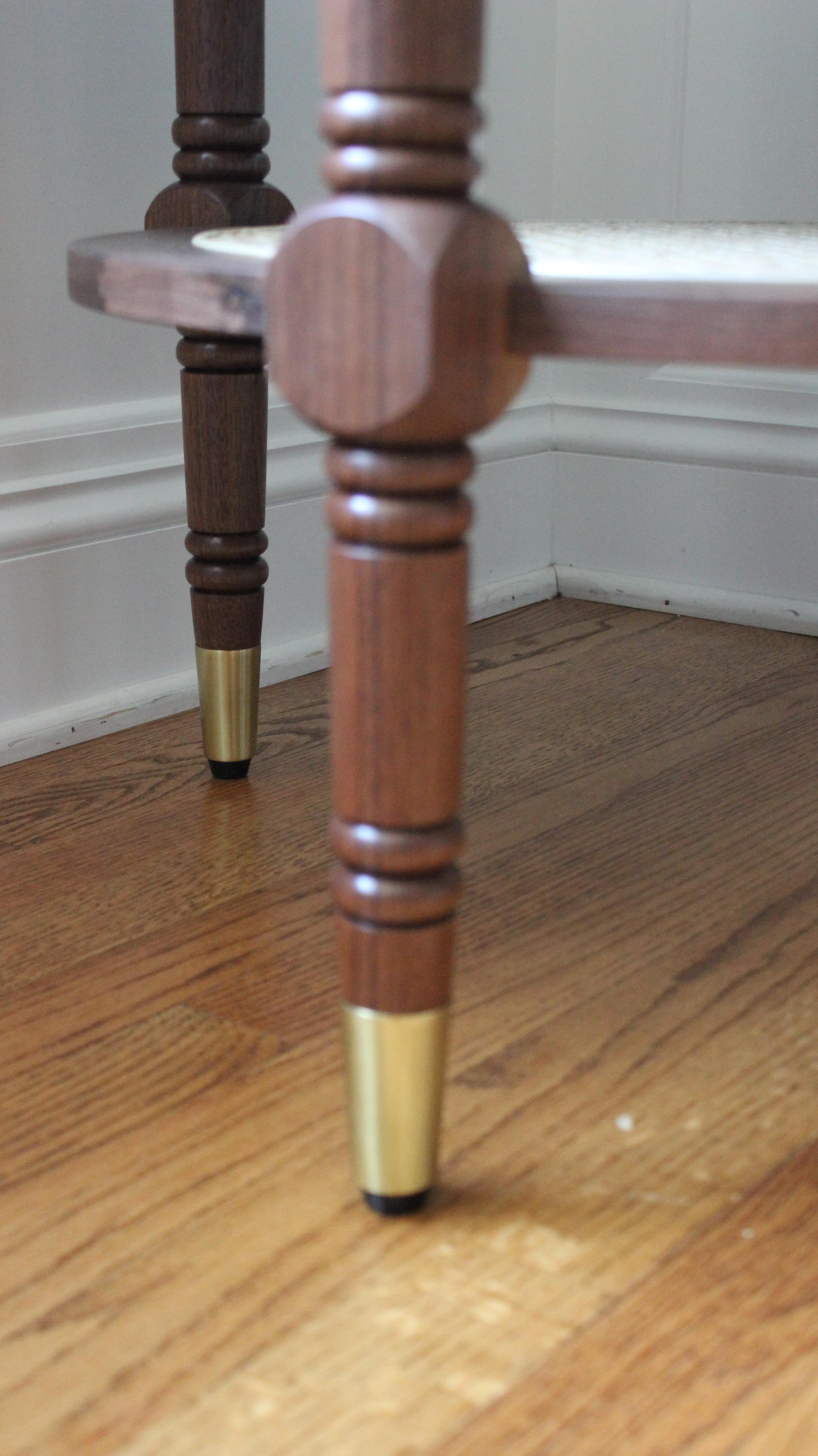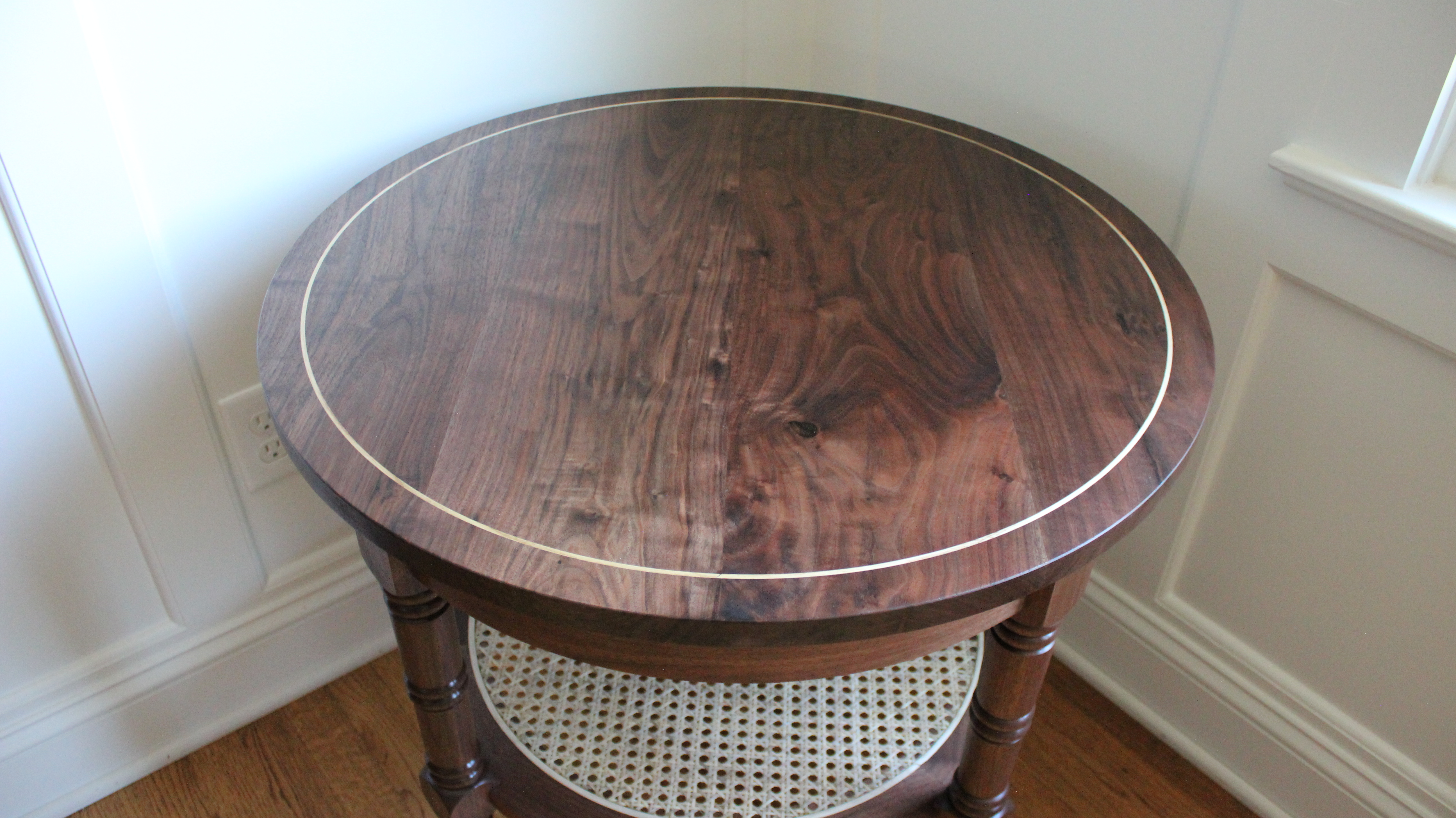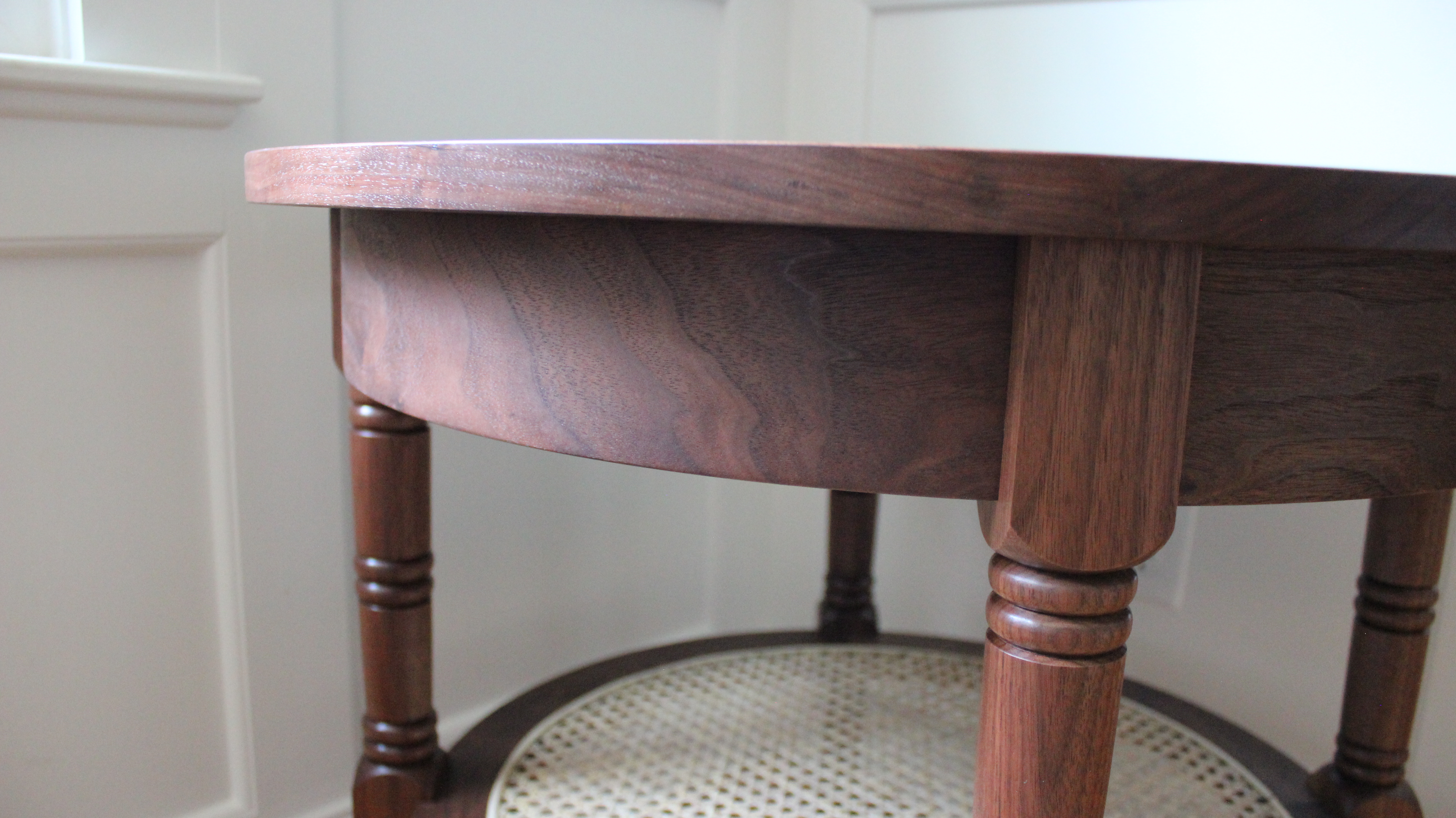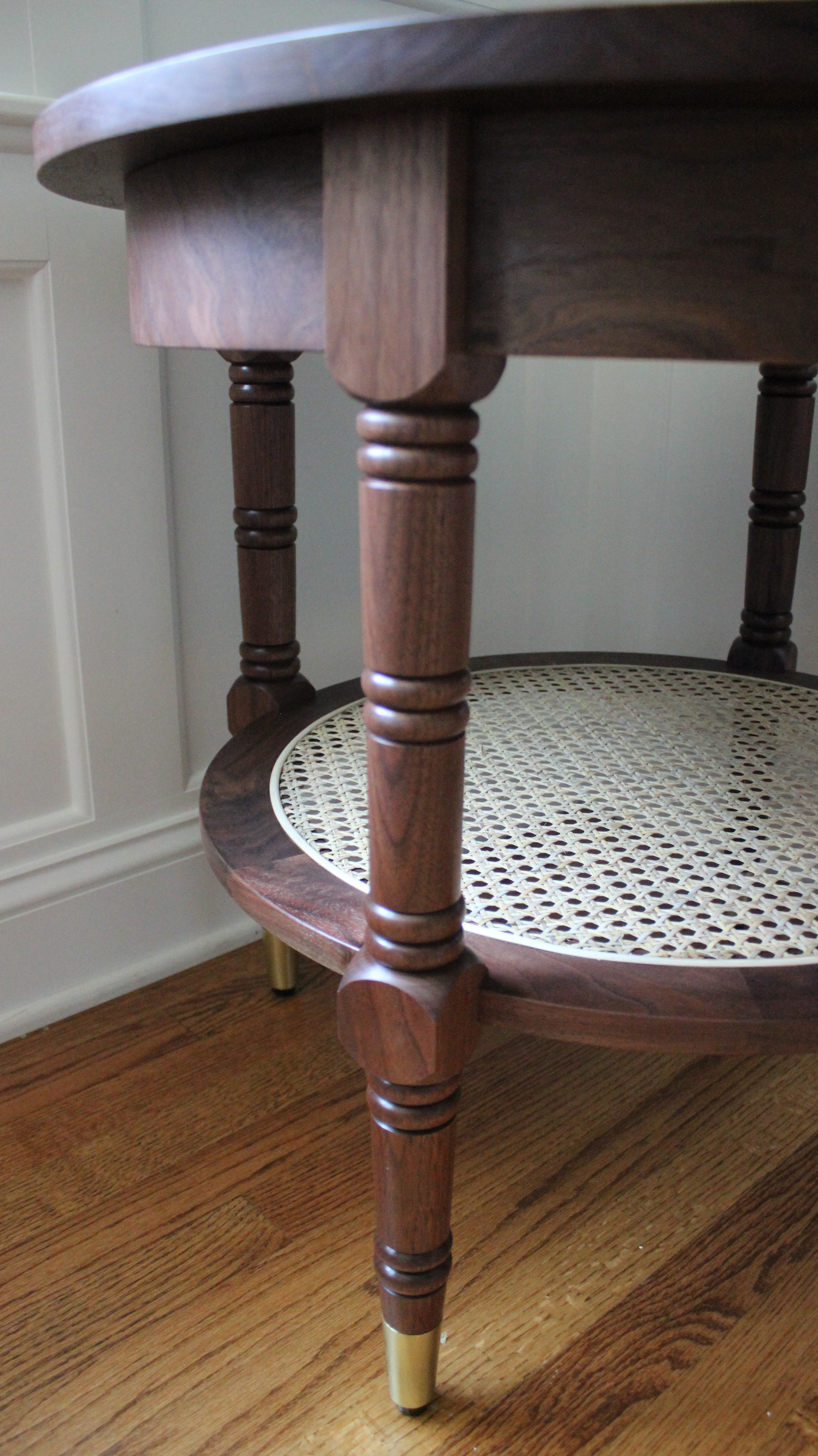 The Hubbard side table blends both formal and casual details for a classic British Colonial design. The round form works great in a corner of the room or in between two chairs. Turned legs with double beads taper to a brass foot for a light, formal aesthetic. The natural rattan webbing in the lower shelf creates a stunning contrast with the deep chocolate tones of the Walnut, and is a classic design element of Colonial furniture of the West Indies. The top features a contrasting inlay border creating visual continuity between the top and bottom.