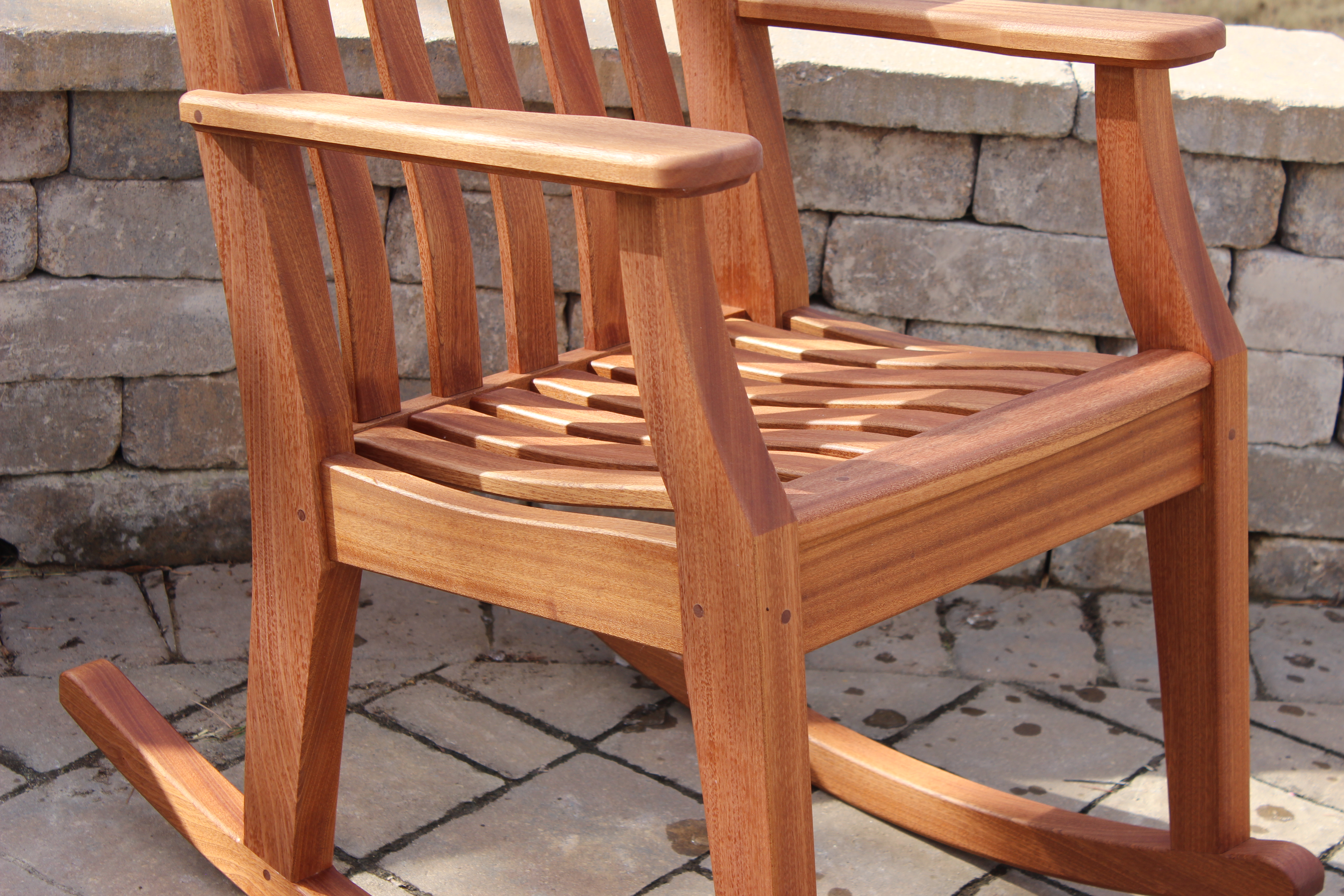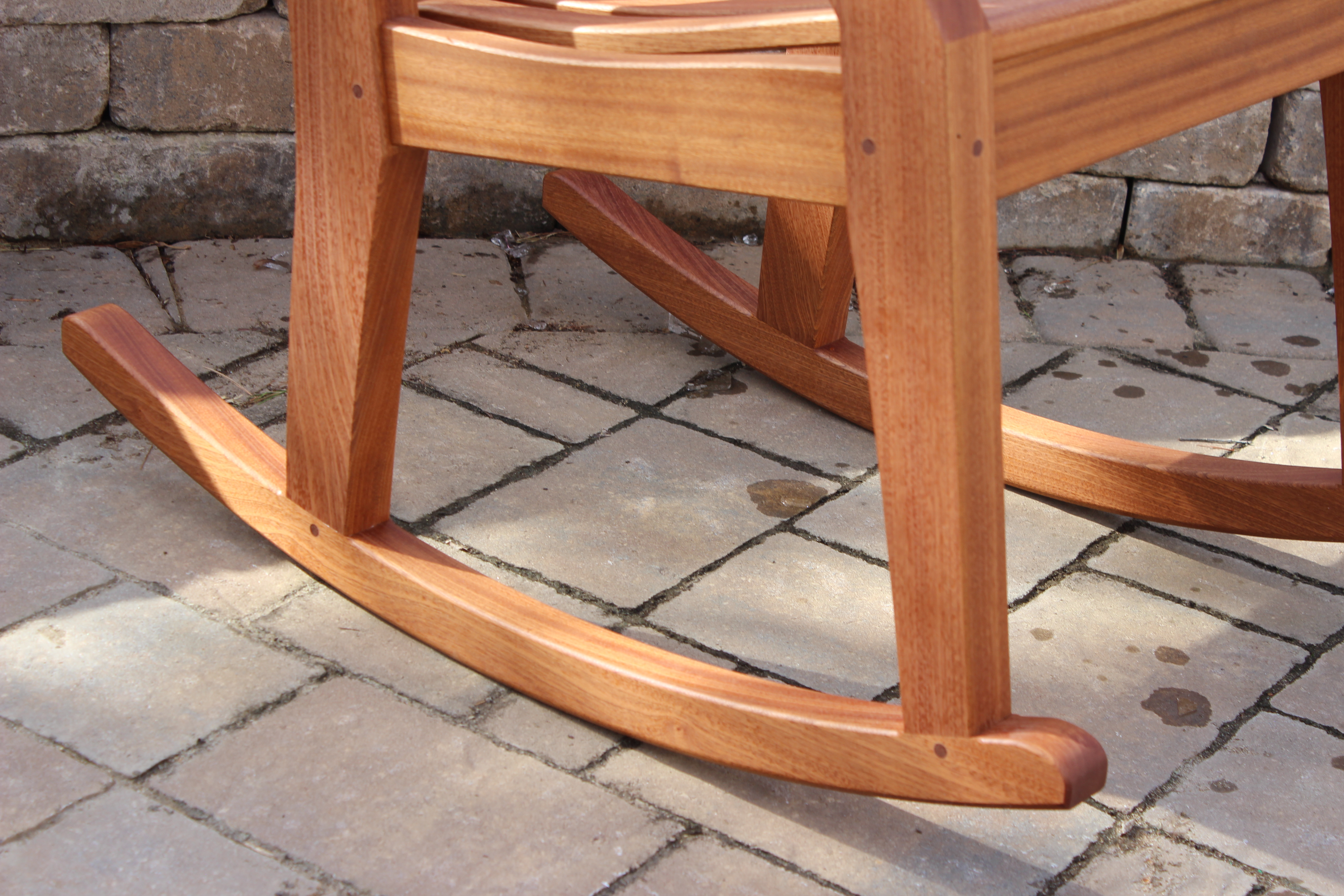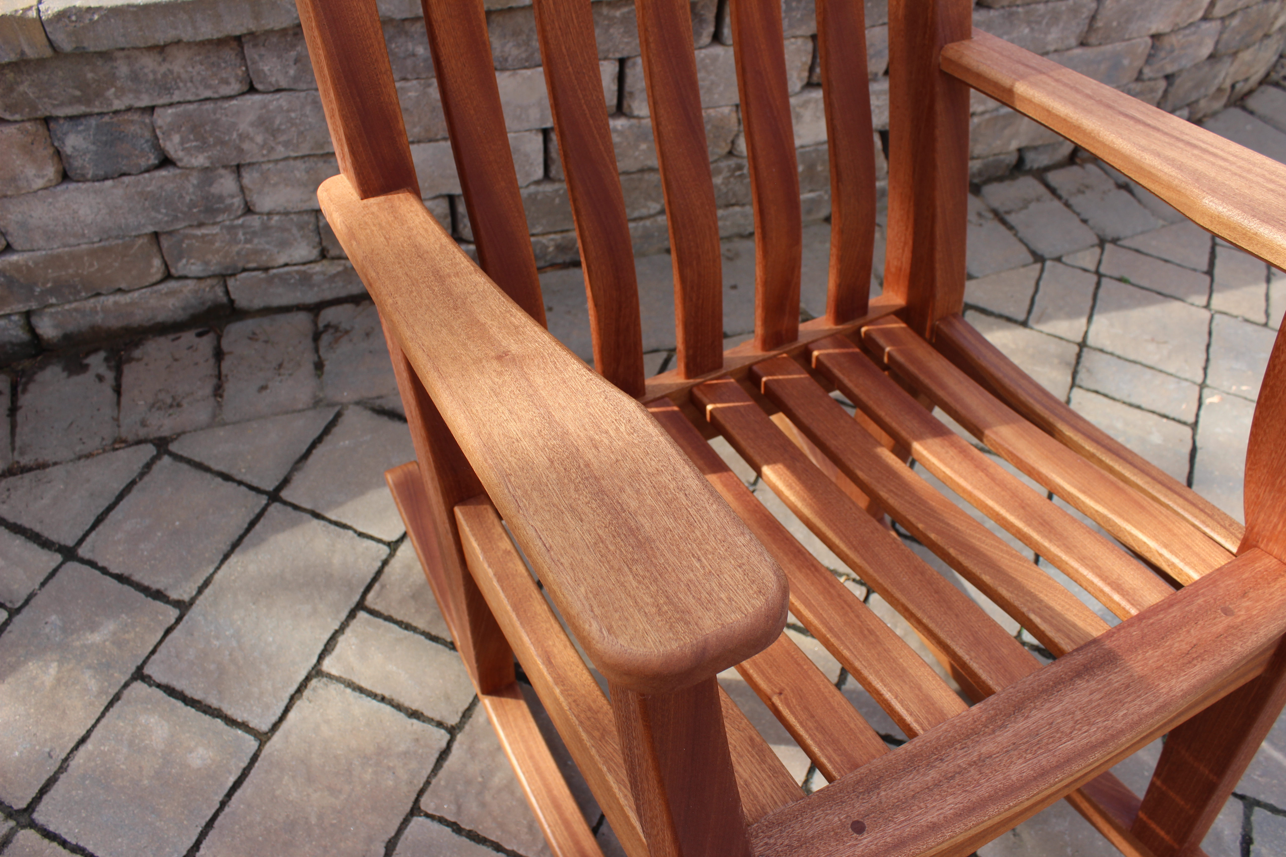 This rocking chair is the perfect place to relax and enjoy the outdoors. Featuring curved back and seat slats that follow the contour of your body, one could sit in these for hours by the fire, in their garden or on the porch. The arms feature a relief towards the back slats providing more room for you to sit while maintaining a larger front section for resting your hand or drink. Compared to store bought rockers, these are much more substantial with thick 1-3/4″ main frame and 3/4″ thick slats. The extra weight, and 44″ rocker radius create a smooth, effortless rock for you to enjoy. Constructed with extra large mortise and tenons, pinned for longevity, these rockers will outlast their owners. Made of Sapele, the chairs are rot resistant and only require minimal maintenance each year. A simple application of exterior oil will maintain the natural, deep red tones of the Sapele. Or, let them age without oil for a weathered, grey look.