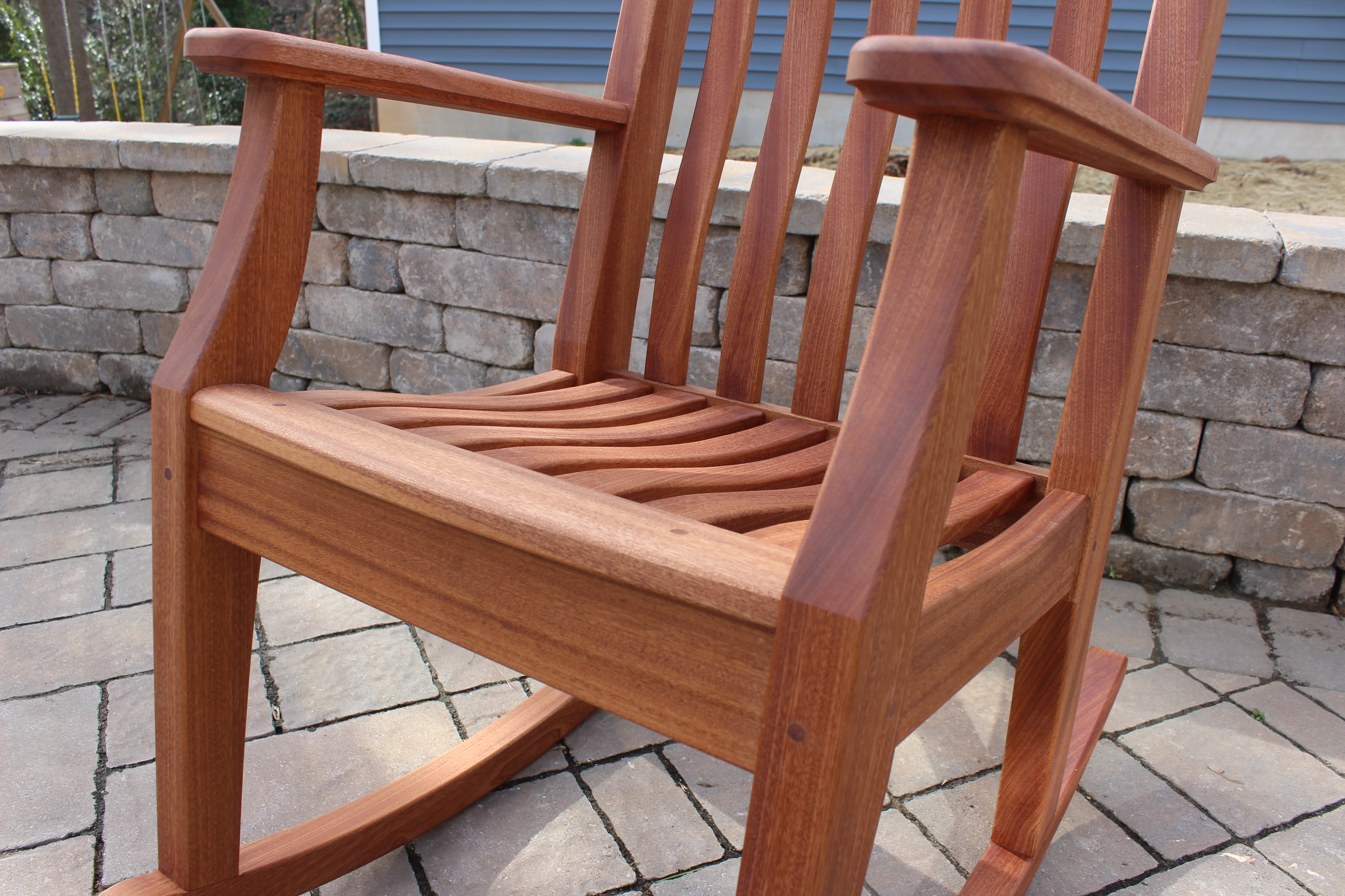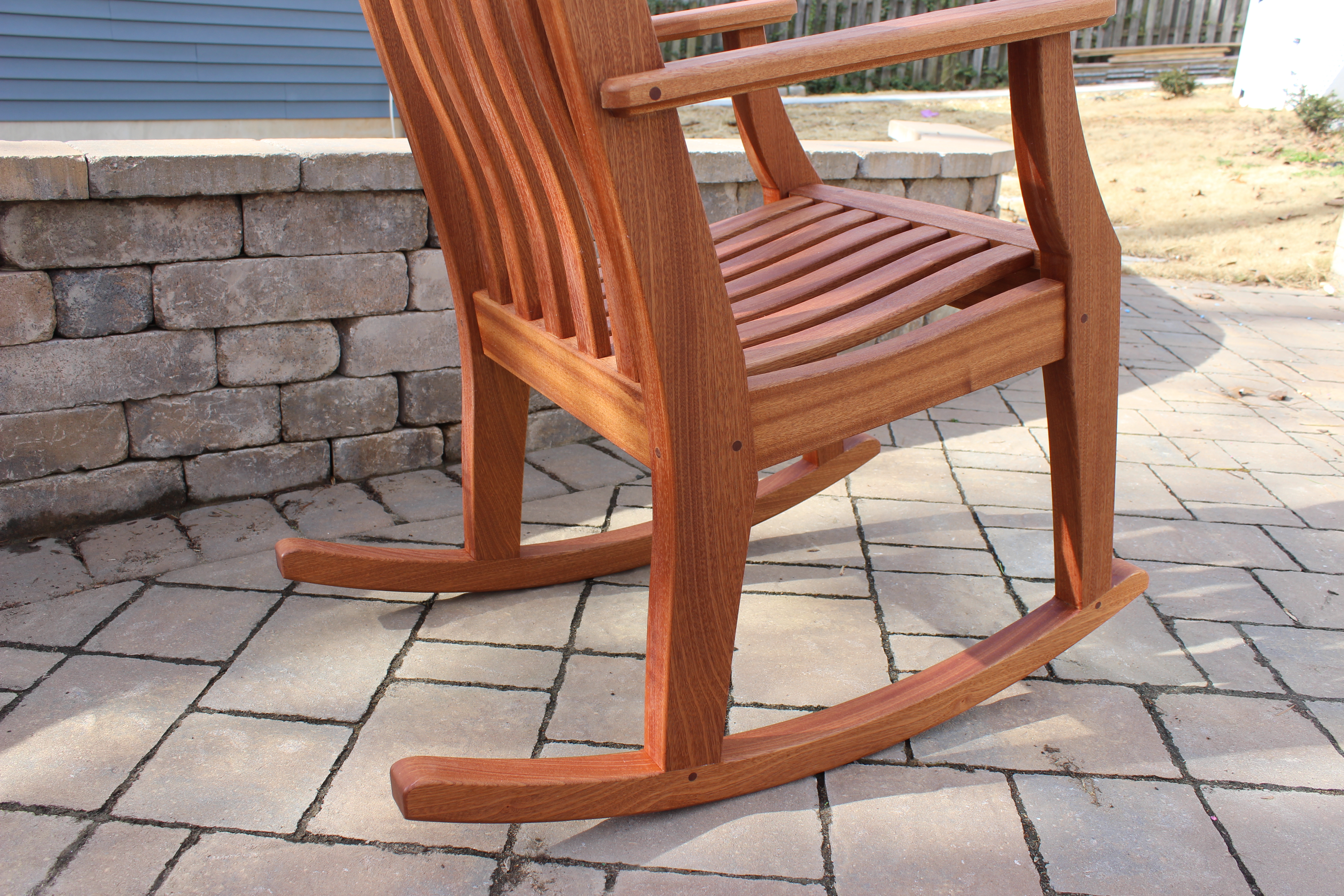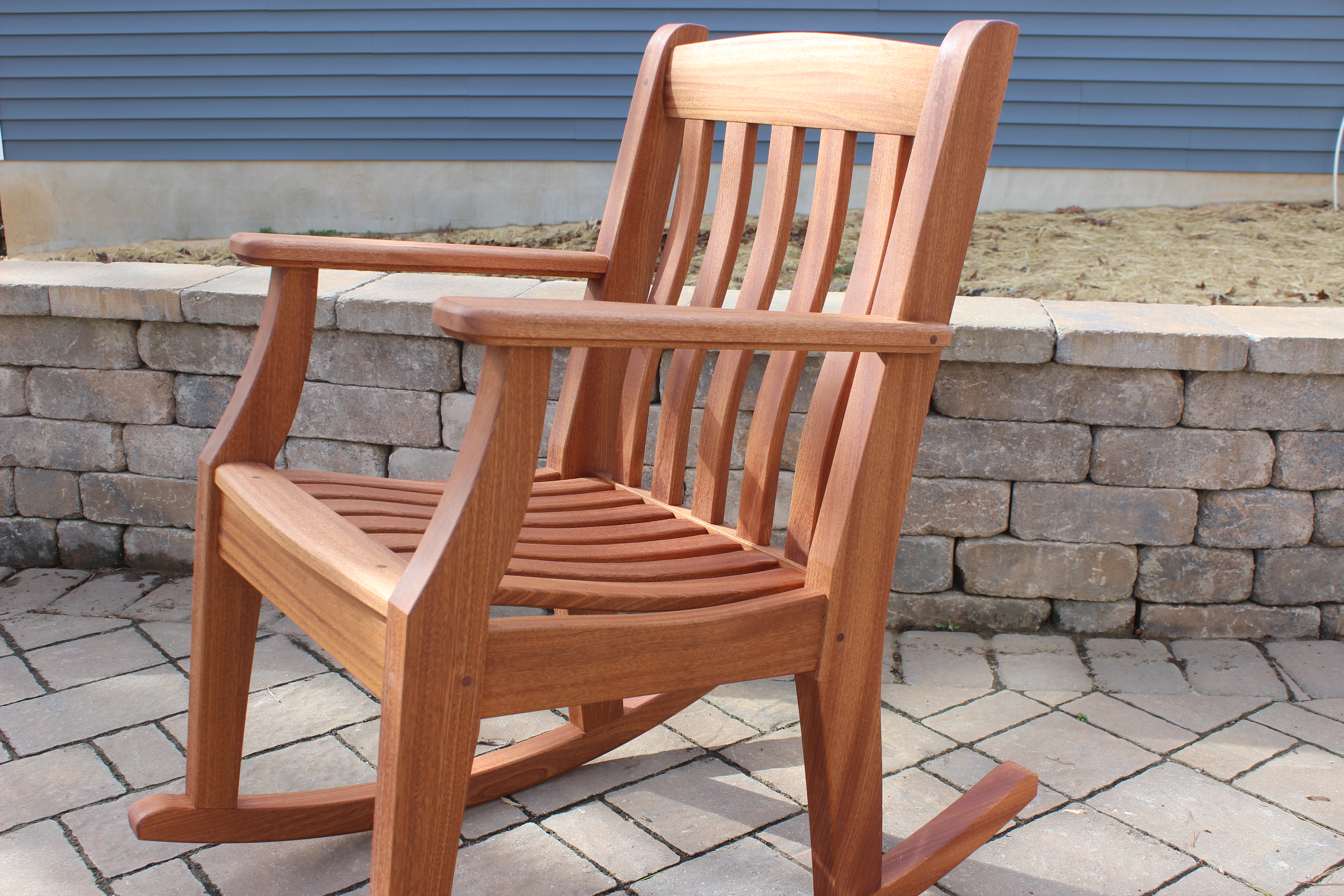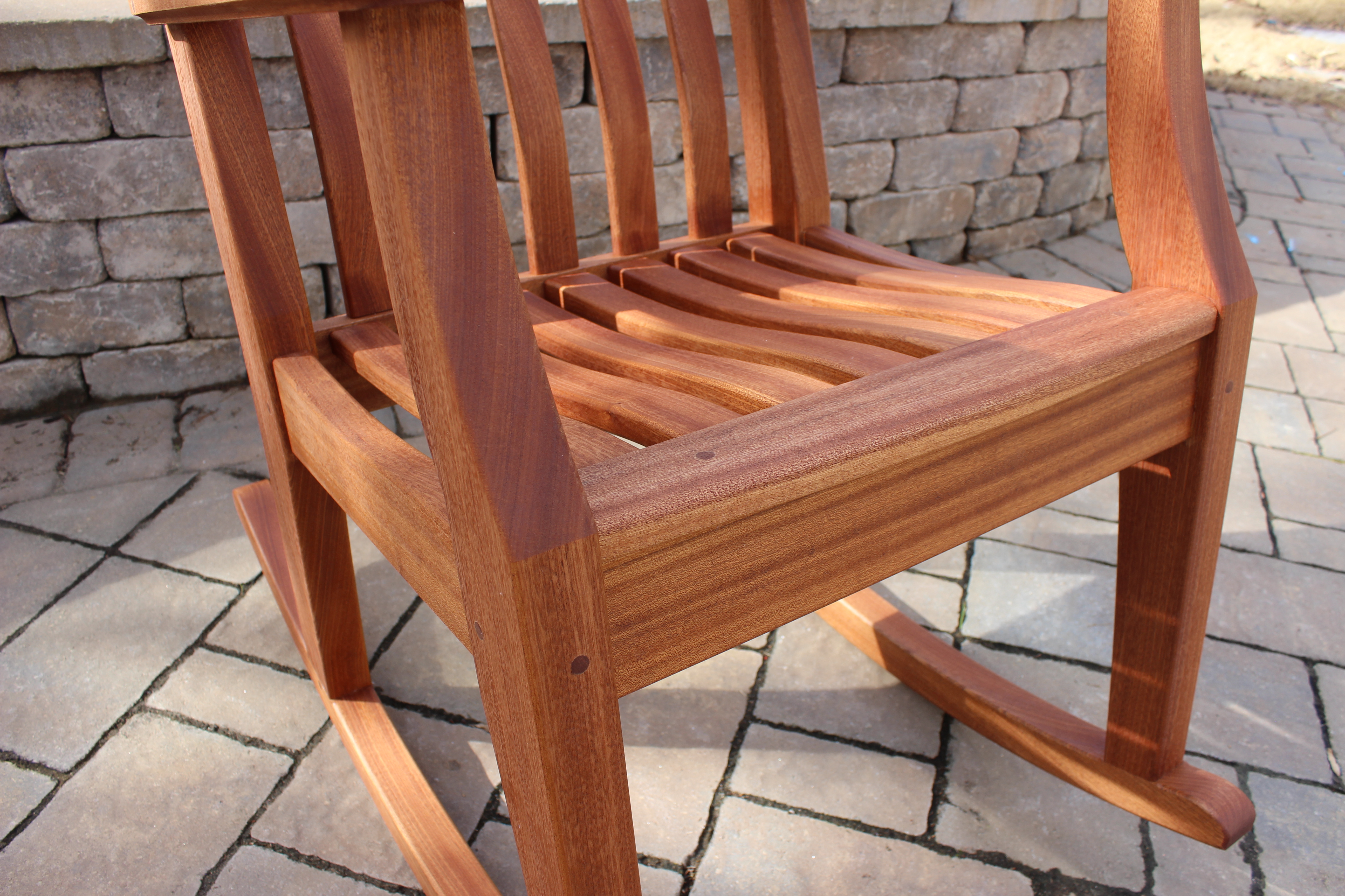 This rocking chair is the perfect place to relax and enjoy the outdoors. Featuring curved back and seat slats that follow the contour of your body, one could sit in these for hours by the fire, in their garden or on the porch. The arms feature a relief towards the back slats providing more room for you to sit while maintaining a larger front section for resting your hand or drink. Compared to store bought rockers, these are much more substantial with thick 1-3/4″ main frame and 3/4″ thick slats. The extra weight, and 44″ rocker radius create a smooth, effortless rock for you to enjoy. Constructed with extra large mortise and tenons, pinned for longevity, these rockers will outlast their owners. Made of Sapele, the chairs are rot resistant and only require minimal maintenance each year. A simple application of exterior oil will maintain the natural, deep red tones of the Sapele. Or, let them age without oil for a weathered, grey look.